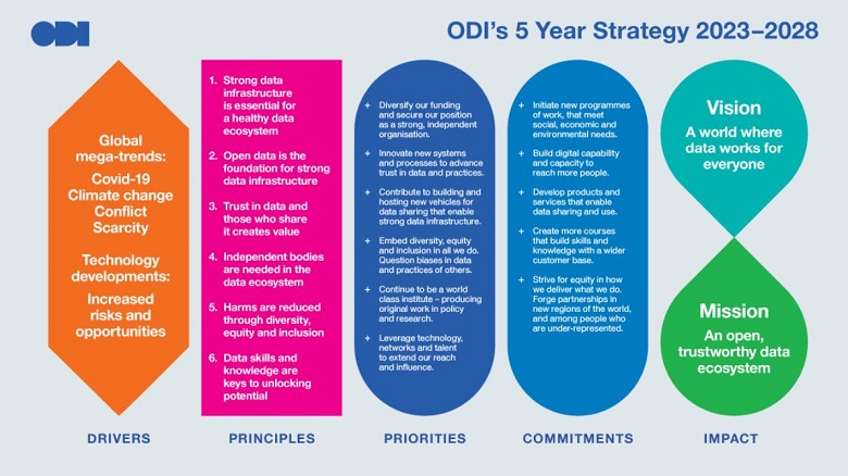 Las prioridades de la ODI para este periodo pasan por diversificar la financiación y asegurar su posición como una organización fuerte e independiente; innovar nuevos sistemas y procesos para aumentar la confianza en los datos y las prácticas; contribuir a construir y alojar nuevos vehículos para compartir datos que permitan una infraestructura de datos sólida; incorporar la diversidad, la equidad y la inclusión en todo lo que hacemos, cuestionando sesgos en datos y las prácticas de otros; continuar siendo un instituto de clase mundial, produciendo trabajos originales en política e investigación; y aprovechar la tecnología, las redes y el talento para ampliar nuestro alcance e influencia.