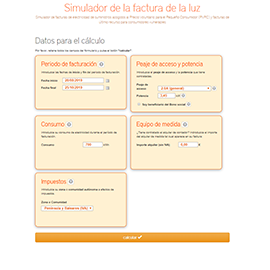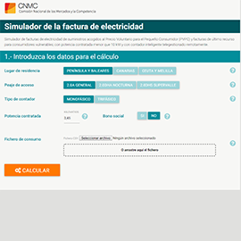 Simulador de facturas de electricidad de suministros acogidos al Precio Voluntario para el Pequeño Consumidor (PVPC) y facturas de último recurso para consumidores vulnerables.