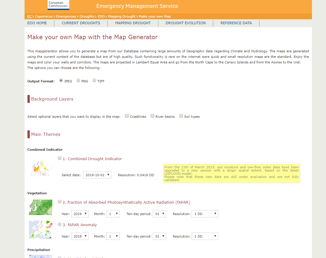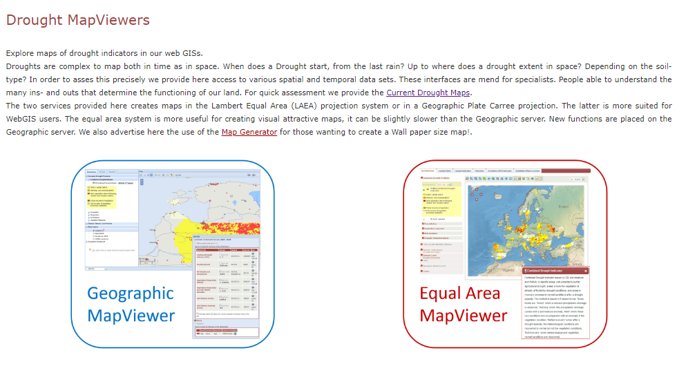 La aplicación ofrece información en forma de mapas y gráficos de indicadores a partir de diversas fuentes (mediciones de precipitaciones, mediciones por satélite, modelos hidrológicos distribuidos, etc.). Para una visión general de la situación en caso de sequía inminente, pueden consultarse las Drought News (Noticias de la sequía, publicadas esporádicamente), y hay una serie de herramientas que permiten visualizar y analizar la información disponible. El Observatorio Europeo de la Sequía brinda a las personas especialistas mapas complejos, y a las responsables políticas, indicadores combinados de alto nivel.