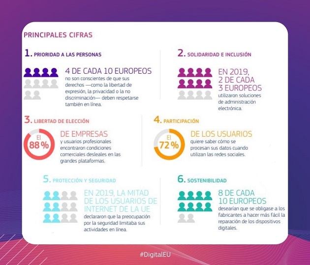 La Declaración Europea sobre los Derechos y Principios Digitales para la Década Digital, firmada el 15 de diciembre de 2022 por el Consejo, el Parlamento Europeo y la Comisión, busca asegurar que la apuesta europea por la transformación digital esté plenamente alineada con los derechos fundamentales, incluyendo la protección de datos y la igualdad de trato, con principios como la neutralidad tecnológica y de la red y la inclusividad, y con el compromiso de mejorar las habilidades y competencias digitales, fomentar un ecosistema de educación digital de alto rendimiento, proteger los derechos de los usuarios en el entorno digital, garantizar la libertad de los medios de comunicación y luchar contra la desinformación.