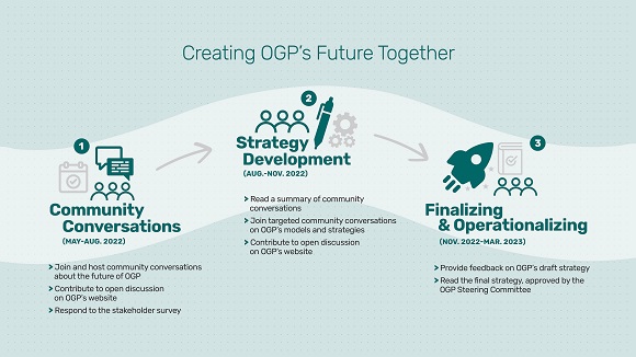 En el mes de mayo de 2022, la OGP solicitó ayuda a la sociedad en general para desarrollar una nueva estrategia a cinco años vista con el objetivo clave de elaborar una visión y una dirección valiosas que alcance repercusión directa en toda la Alianza. Todo parte del hecho indiscutible de que la OGP, en los comienzos de esta segunda década de existencia, ha crecido y alcanzado resultados que han superado las expectativas iniciales de sus miembros fundadores. Nadie esperaba lograr el tamaño y alcance actuales cuando ocho gobiernos y nueve líderes de la sociedad civil lanzaron esta organización. Por ello, la OGP hace un llamamiento a su comunidad de personas reformadoras para intensificar y participar activamente en el desarrollo de una nueva estrategia de OGP para 2023-2028.