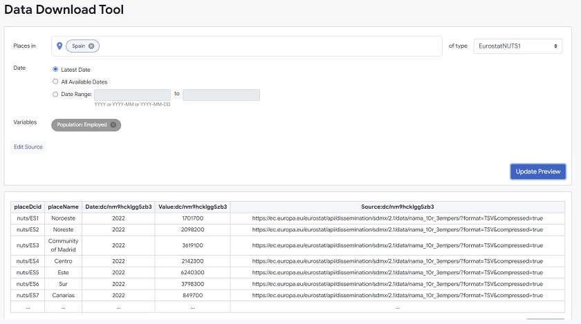 - Herramienta de descarga de datos: Permite descargar datos de las variables estadísticas, siguiendo unos sencillos pasos: ingresar un lugar en el cuadro de búsqueda y sleccionar el tipo de lugares para los que se desea descargar datos; seleccione hasta 5 variables estadísticas( hay miles de ellas para elegir, organizadas en una jerarquía temática); y elegir si se desean los datos de la fecha más reciente, todas las fechas disponibles o un rango de fechas personalizado.