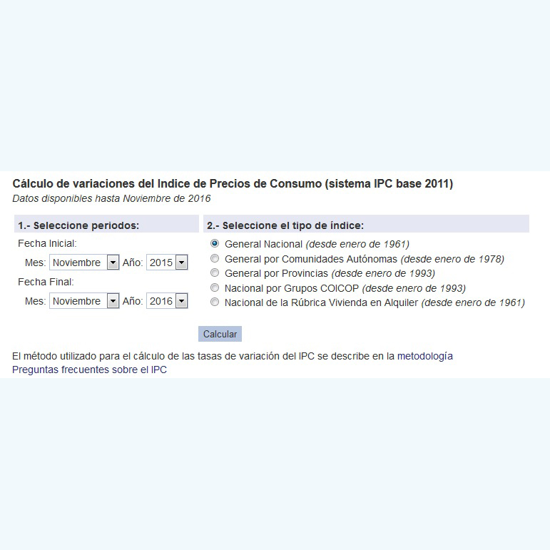 Aplicación que permite calcular la tasa de variación del IPC entre dos períodos cualesquiera. Se puede seleccionar el índice general para el total nacional, las comunidades autónomas y las provincias. También los grupos según la clasificación COICOP para el total nacional.