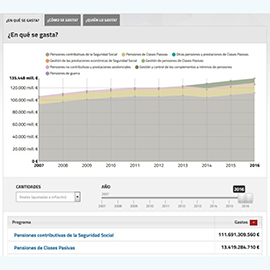 Aplicación web que permite visualizar los gastos anuales de la Administración Central del Estado (ministerios, agencias dependientes y otros organismos públicos, como el Congreso) y de la Seguridad Social, tal y como aparecen recogidos en los Presupuestos Generales.