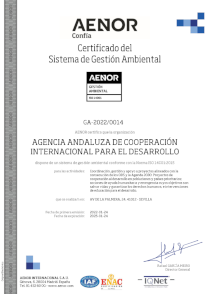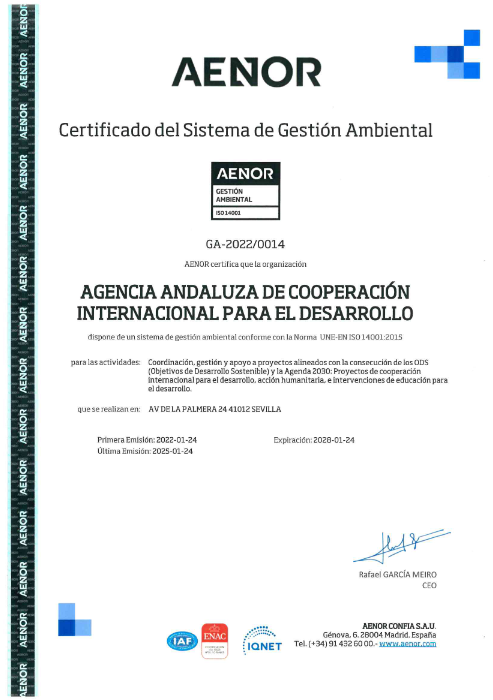 El pasado 24 de enero de 2022, la AACID obtuvo la certificación de Gestión Ambiental ISO 14001 por AENOR para la Coordinación, gestión y apoyo a proyectos alineados con la consecución de los ODS y la Agenda 2030: