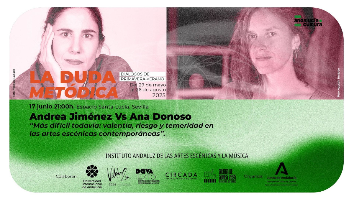 Un nuevo encuentro del ciclo La Duda Metódica recala en el Espacio Santa Lucía el martes día 17 bajo el nombre ‘Más difícil todavía: valentía, riesgo y temeridad en las artes escénicas contemporáneas’, con las creadoras Andrea Jiménez y Ana Donoso como protagonistas. La cita, a partir de las 21:00 horas está organizada en el marco del Festival Circada. La segunda edición del ciclo de encuentros creado por el Instituto Andaluz de la Artes Escénicas y la Música (IAAEM) de la Consejería de Cultura y Deporte y gestionado a través de la Agencia Andaluza de Instituciones Culturales, comenzó el pasado jueves 29 de mayo y contará con un total de ocho conversatorios.