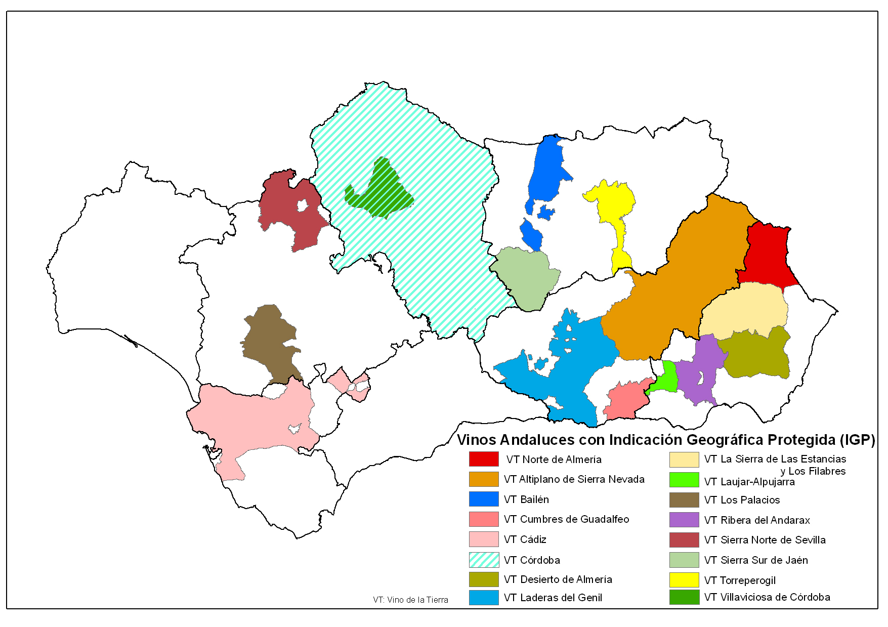 Andalucía es la Comunidad con más vinos amparados por Indicaciones Geográficas Protegidas, pues cuenta ya con 16 Vinos de la Tierra muy distribuidos por su territorio.