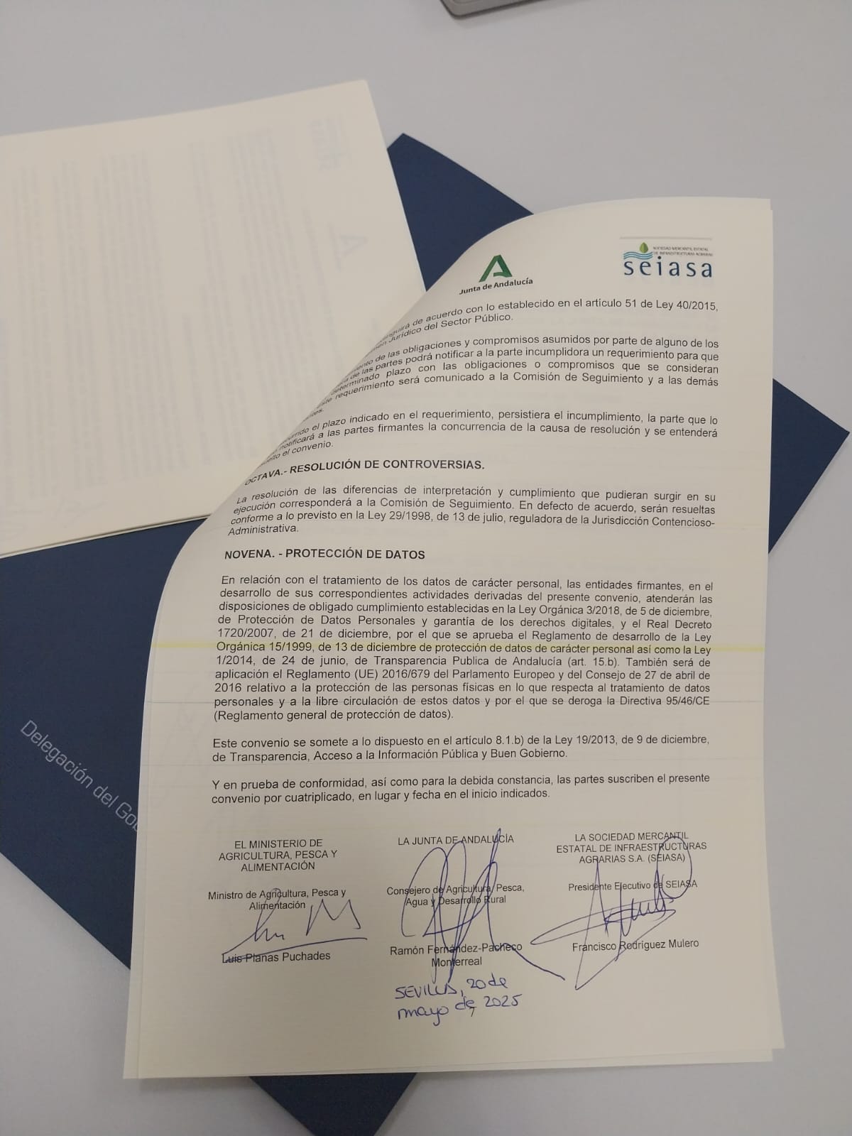Según ha explicado el consejero de Agricultura, Pesca, Agua y Desarrollo Rural, Ramón Fernández-Pacheco, “a pesar de que hace un mes desde que el Gobierno central escenificó en Sevilla la firma de dicho documento, el convenio no se ha recibido hasta este mismo martes en la sede de la consejería y ha sido en ese preciso momento en el que se ha firmado, por lo que la vigencia del mismo comienza a partir de este martes”.