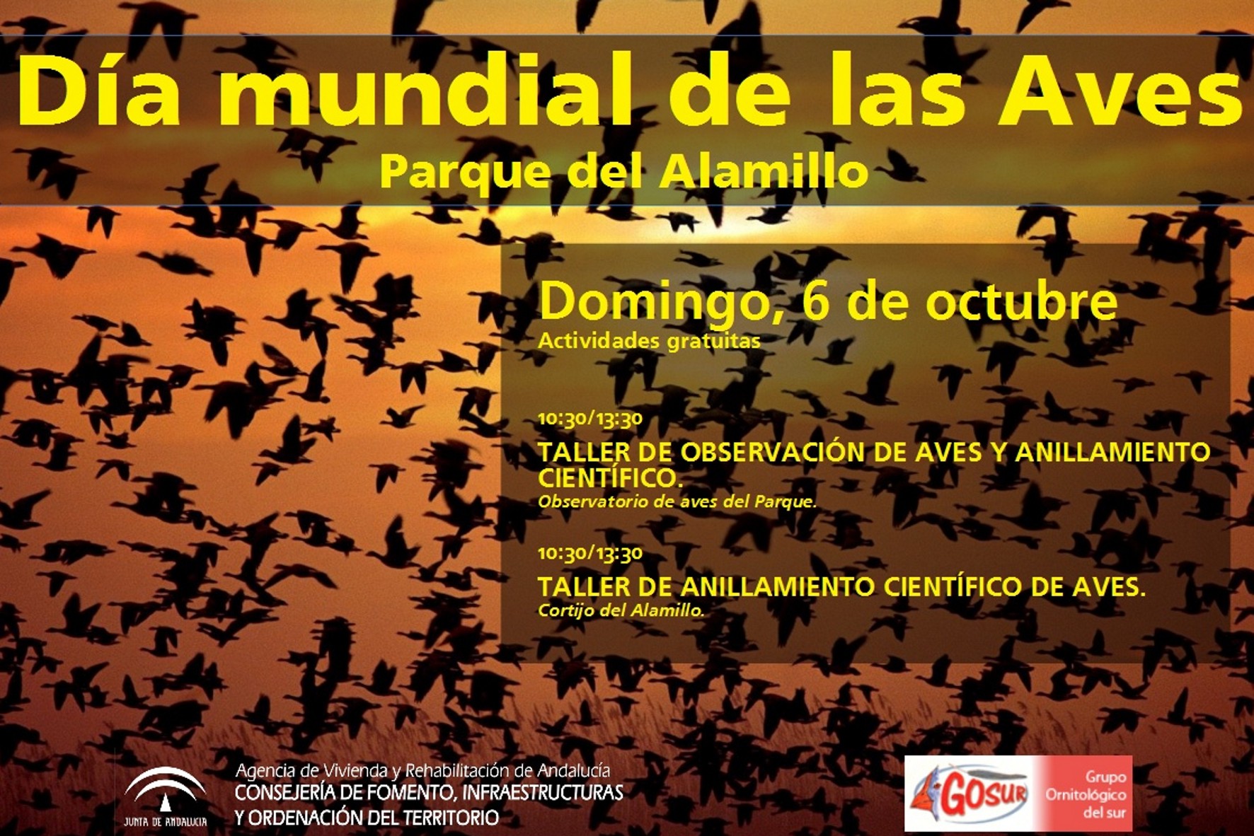 El Parque Metropolitano del Alamillo se une el próximo domingo 6 de octubre a la conmemoración del Día Mundial de las Aves, ofreciendo una programación de actividades organizada por el Grupo Ornitológico del Sur (GOSUR), con la colaboración de la Consejería de Fomento, Infraestructuras y Ordenación del Territorio que, como institución responsable del parque, se suma a este proyecto de difusión medioambiental poniendo a disposición las instalaciones de este espacio metropolitano que gestiona la Agencia de Vivienda y Rehabilitación de Andalucía.
