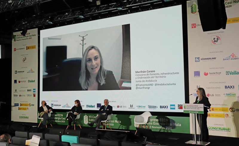 La consejera de Fomento, Infraestructuras y Ordenación del Territorio, Marifrán Carazo, ha participado hoy en el Congreso online de Edificios de Energía Casi Nula, donde ha defendido la innovación como una de las principales bazas para mejorar la gestión de la vivienda en Andalucía. En el congreso, organizado por el Grupo Tecma Red, ha compartido las líneas estratégicas del Gobierno andaluz en materia de vivienda nueva y rehabilitación, en una mesa redonda de expertos sobre la descarbonización de la edificación como palanca para reactivar el sector de la construcción.