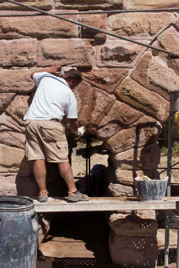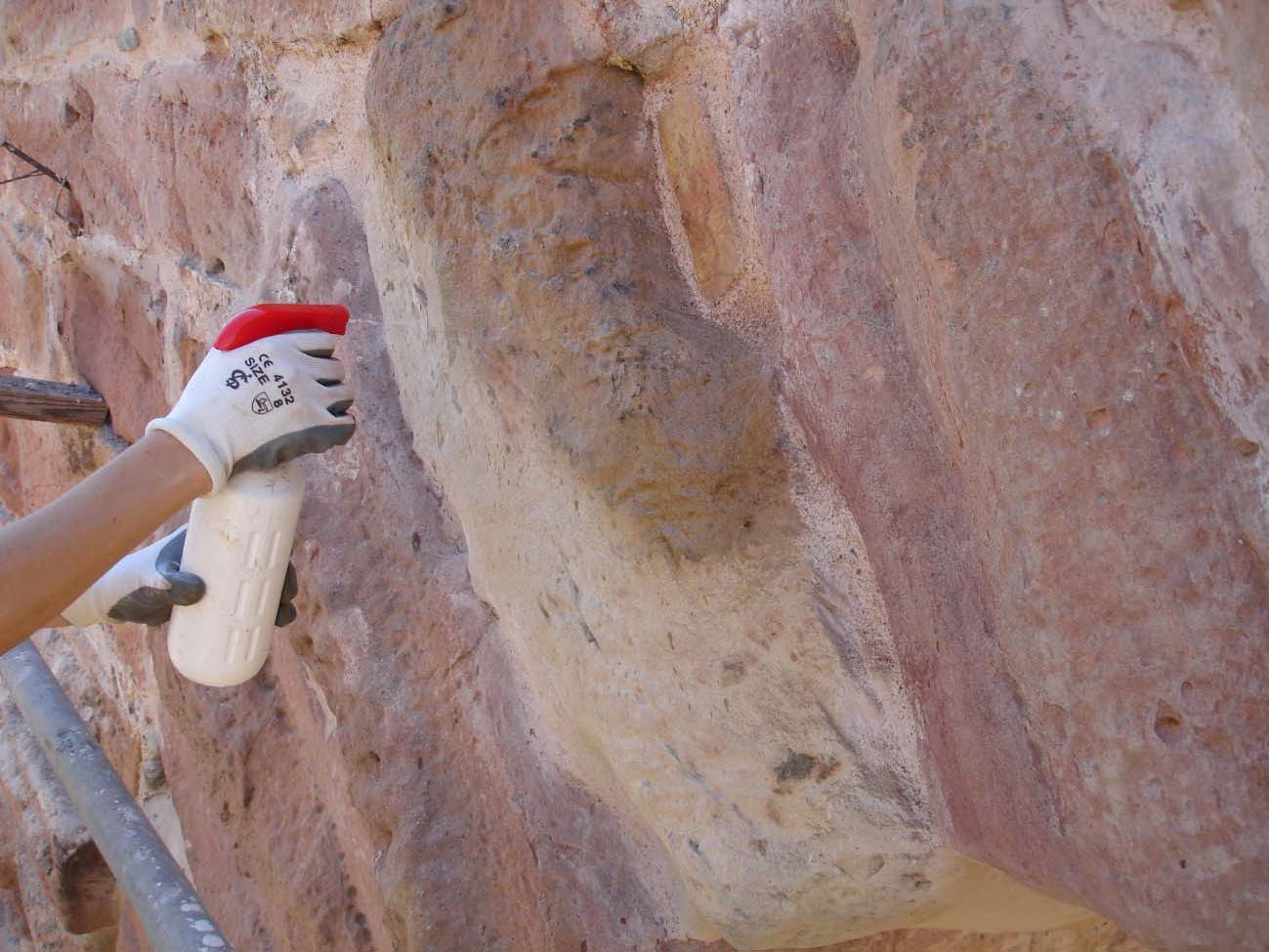 En los sillares más afectados por la pérdida de sus propiedades mecánicas se efectuó un tratamiento puntual de consolidación a base de silicato de etilo.