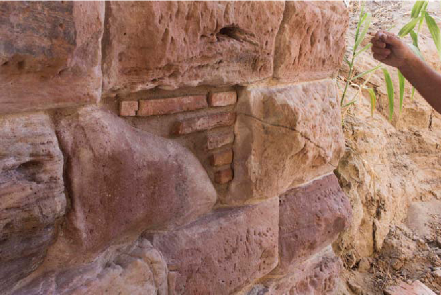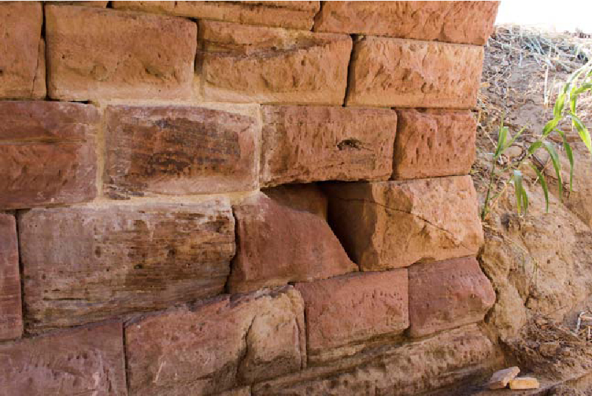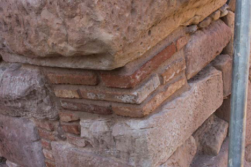 – Para las pérdidas de mayor tamaño en muros se ejecutó fábrica de ladrillo de tejar, colocado a soga, reproduciendo las juntas de sillares cuya cara vista había desaparecido con una junta corrida que reproduce la forma del original.