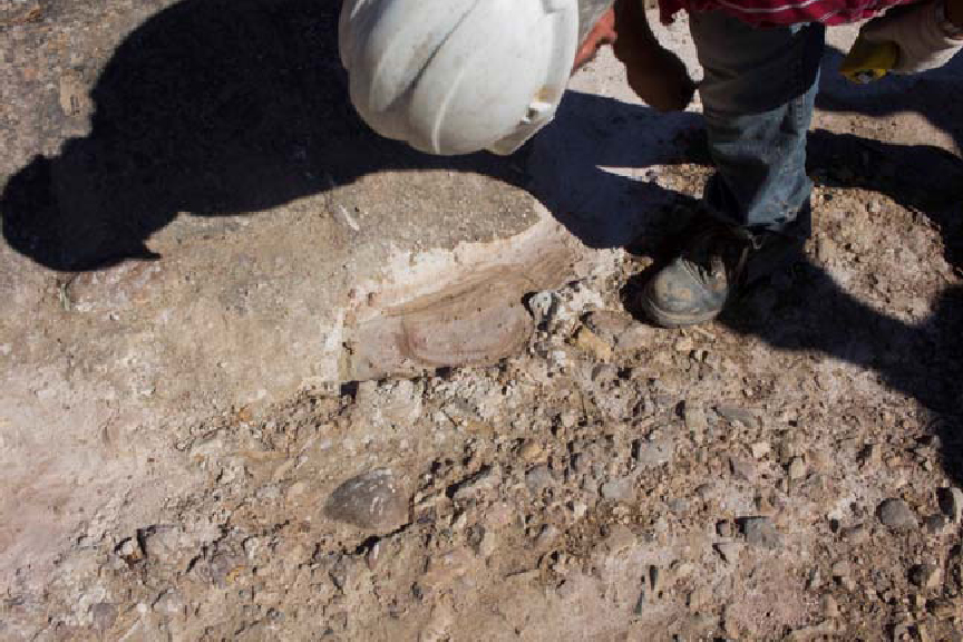 Para proteger el tablero y la fábrica cubierta por él se ejecutó una solera de mortero de cal de diez centímetros de espesor sobre un lecho de arena estabilizada con cal, extendida sobre un geotextil que separa la actuación del substrato. En los bordes de la solera se extendió una lámina plástica sobre los sillares y se llevó el mortero hasta dicha lámina. De esta manera se evita que la arena se lave y se comprometa la durabilidad de la solución, sin tocar en ningún punto la fábrica ni el substrato.