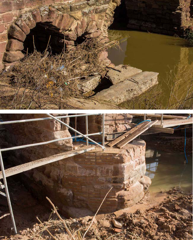 – En los lugares en los que no era posible introducir ladrillos o medios ladrillos, se utilizaron cantos rodados encontrados en el entorno del puente, que son los mismos empleados en reparaciones anteriores. Estas piezas más pequeñas permiten rellenar juntas lavadas de menor espesor que pueden ser muy profundas y desestabilizar tanto como las mayores, muy visibles.