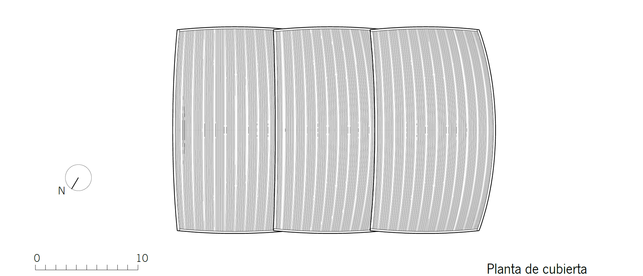 En el diseño de la cubierta se puso especial empeño en reducir el impacto de un edificio de estas dimensiones en el entorno (20,15 m x 31,40 m en planta y entre 5,00 m y 8,30 m de altura). Para fragmentar visualmente el edificio y mejorar su integración dentro del paisaje, la cubierta se dividió en tres paños iguales, formados por superficies de doble curvatura y con distinta inclinación entre sí, que simulan una posible reconstrucción virtual de las lomas de tierra que se excavaron para llegar al nivel de los restos.