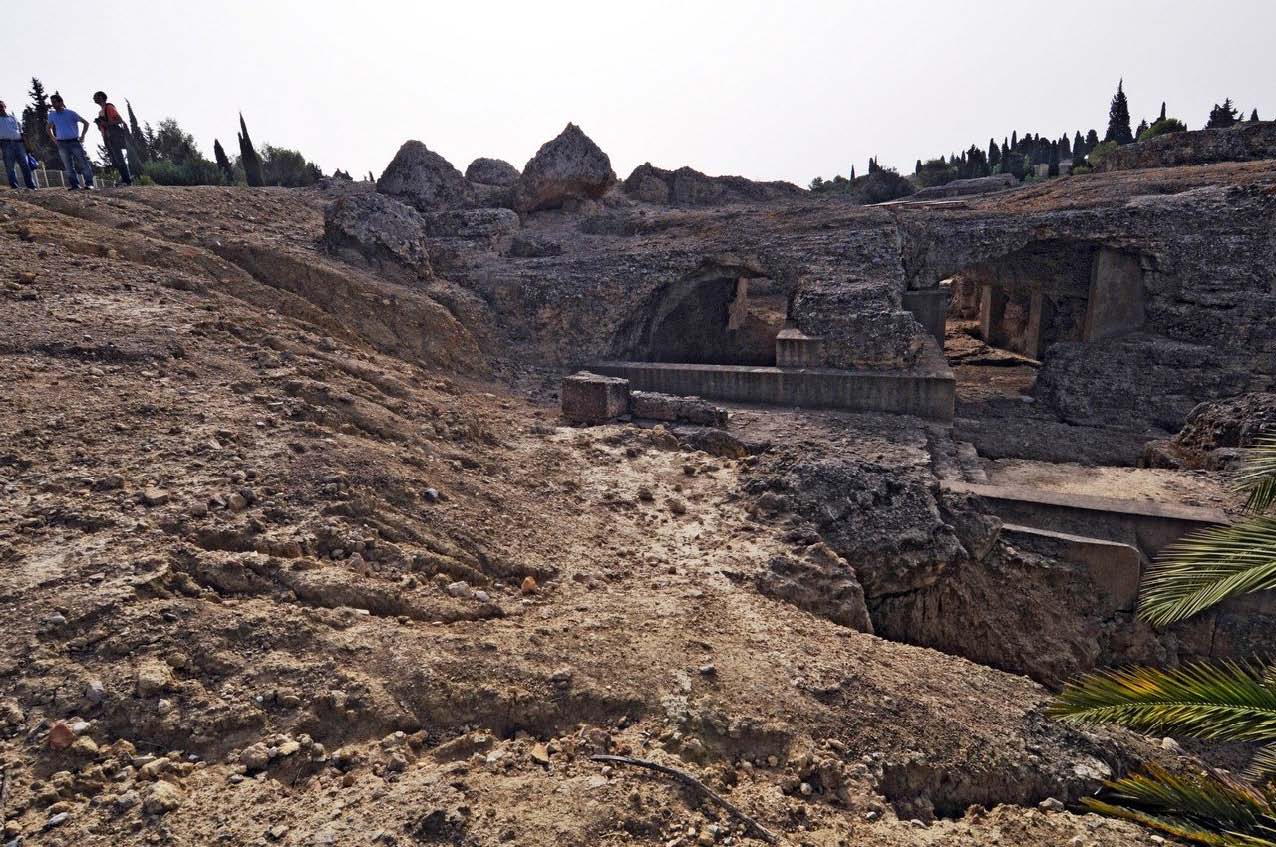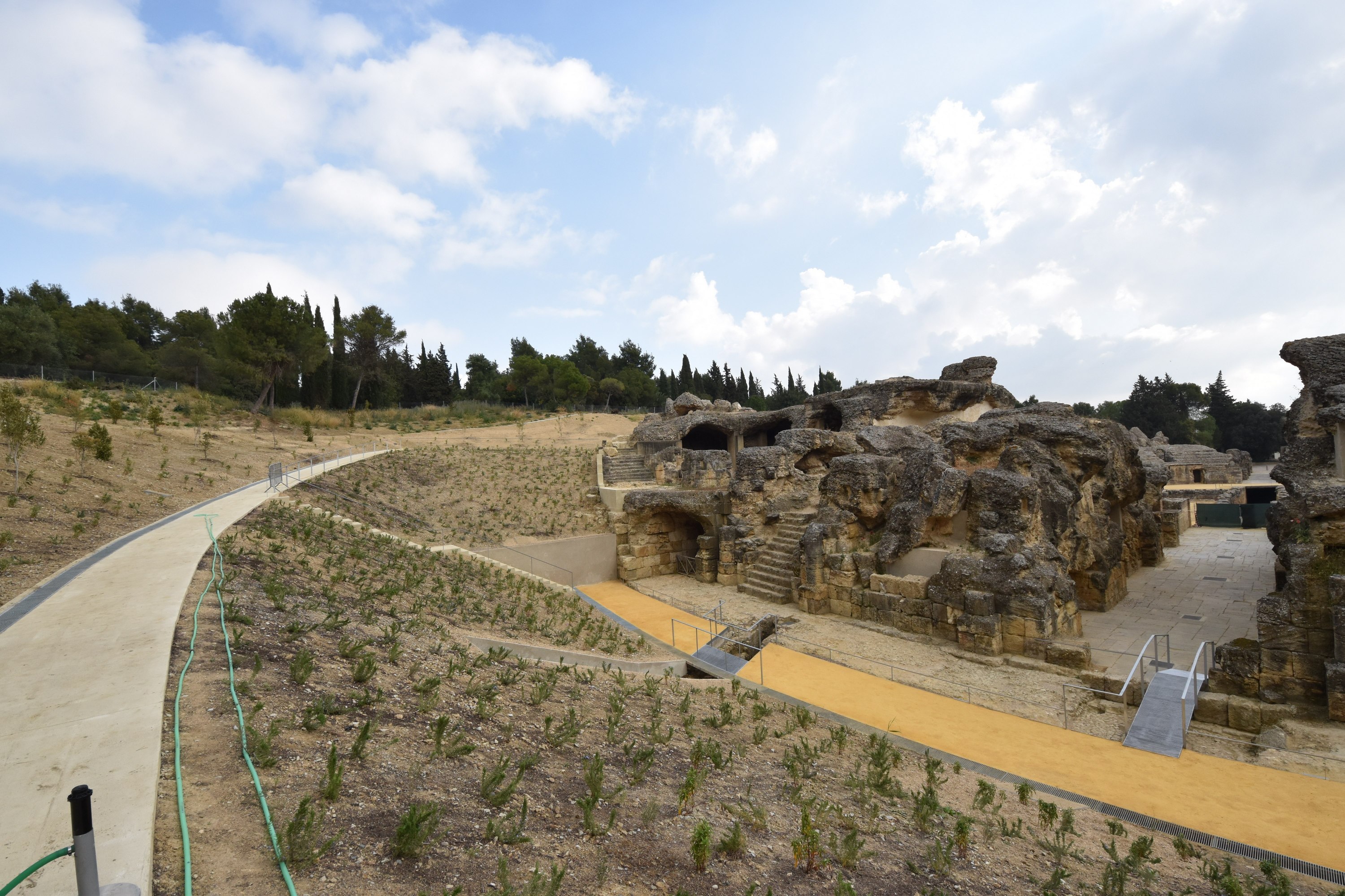 Se han actualizado los sistemas de contención en el encuentro con el edificio, se ha llevado a cabo una reordenación del sistema de drenaje -que permite encauzar la evacuación de aguas a través de las cloacas romanas- y se han construido pasarelas y caminos perimetrales de acceso y recorrido público. Las nuevas sendas se asocian al trazado del sistema de drenaje proyectado, que se dota de canalizaciones para preinstalación de electricidad (futura iluminación monumental y balizamiento) y riego.