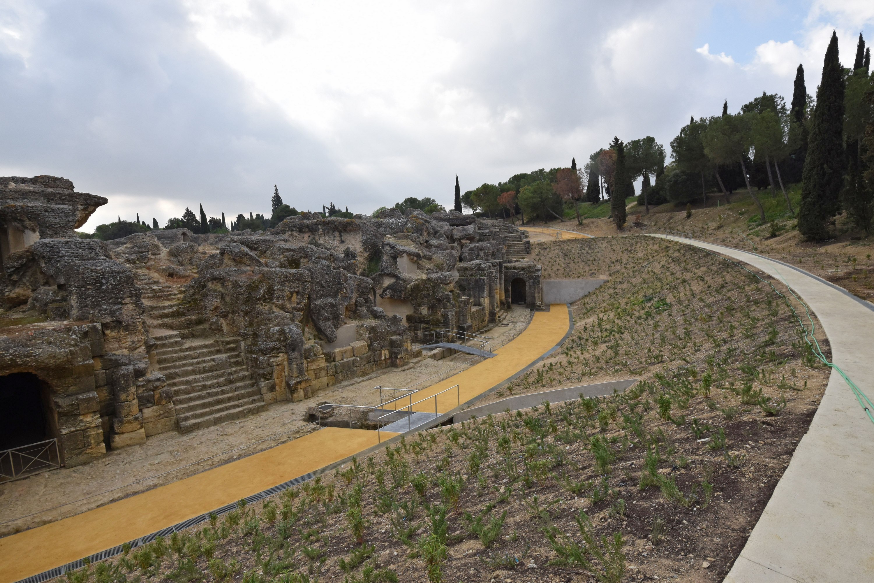Para resolver estos problemas se han realizado una serie de estudios previos que han incluido levantamientos planimétricos, trabajos de prospección y reconocimiento de la red de saneamiento existente, estudios hidrológicos, movimientos de tierra, limpiezas y estabilización de zonas, así como el diagnóstico del estado estructural de los sectores norte y oeste del anfiteatro, tras los cuales se concluyó con la redacción del proyecto “Intervención en el anfiteatro de Itálica: sector oeste y entorno de la puerta libitinaria”. Las obras definidas en él incluyen acciones tan necesarias como la conservación preventiva de las fachadas de este sector del anfiteatro, la actualización y mejora del sistema de drenaje de la ladera y la reorientación de caminos y recorridos, posibilitando la reapertura del itinerario de visitas.
