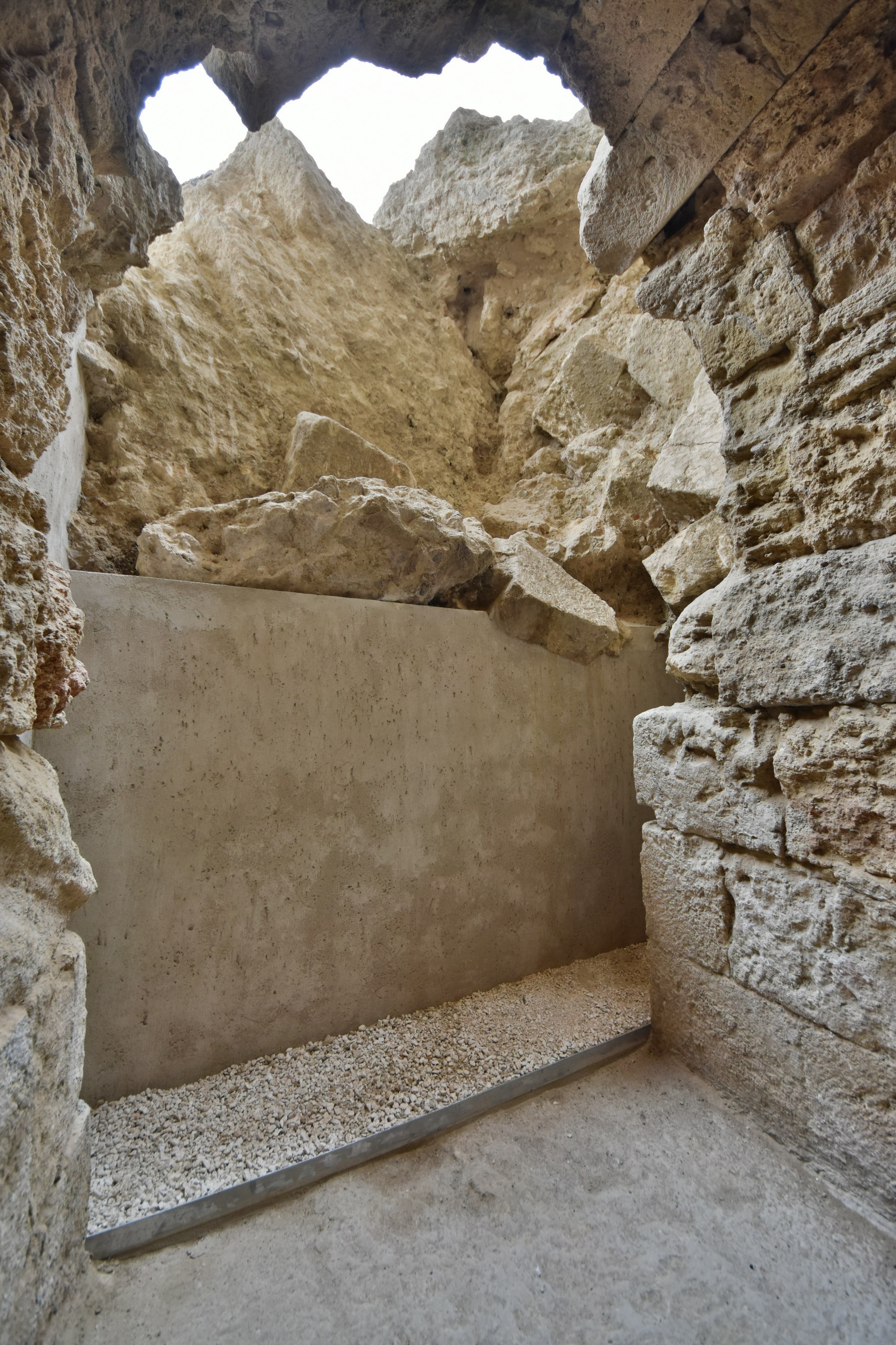 En el edificio se ha realizado la excavación superficial y retirada de rellenos, con el objeto de conseguir plataformas estables para facilitar la evacuación controlada de las aguas de lluvia, con recuperación de elementos constructivos originales. La estabilización y consolidación de masas estructurales inestables ha requerido, en situaciones puntuales, apoyos complementarios sobre muros auxiliares, cuyo tratamiento neutro los presenta en un discreto segundo plano.