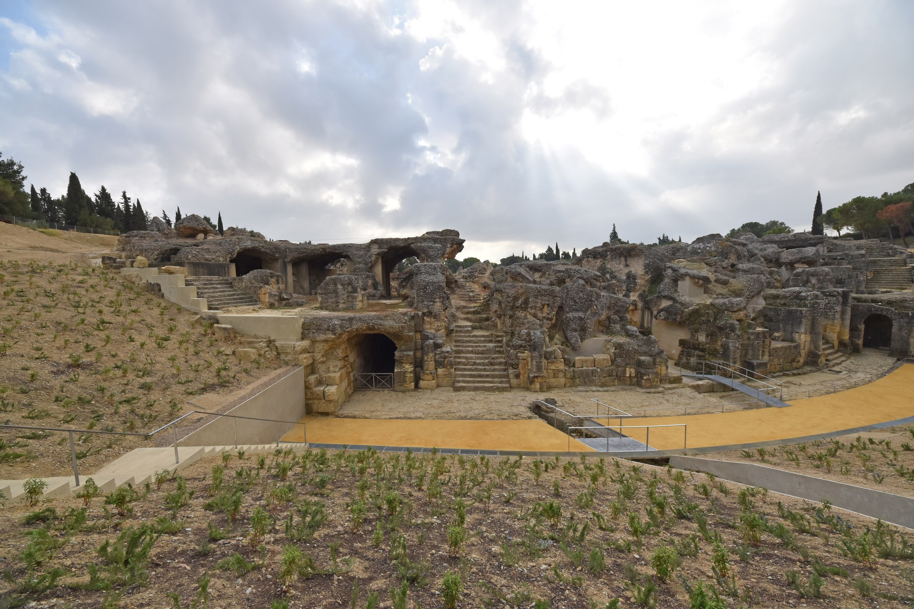 El anfiteatro de Itálica, construido en época del emperador Adriano, se encuentra entre los mayores del Imperio romano. Miden sus ejes principales 152,8 m por 130,6 m, y los de la arena 70,6 m por 47,3 m. Su aforo aproximado era de unas 20.000 a 25.000 personas.