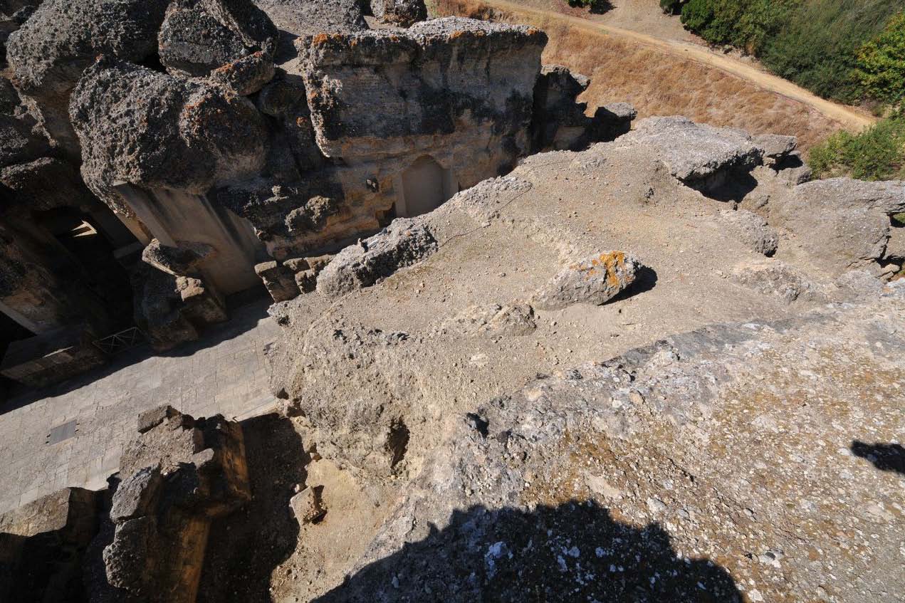 La intervención contemplada en esta reseña complementa los trabajos de consolidación estructural realizados con anterioridad en el anfiteatro y posibilita la ampliación del recorrido de visitas a este sector con extensión al exterior de la puerta libtinaria. Para hacerlo posible, se ha resuelto la incidencia que la proximidad de las laderas norte y oeste producía sobre el edificio en parte aterrado por los aportes realizados para el trazado de caminos forestales y sobre su sistema hidráulico.