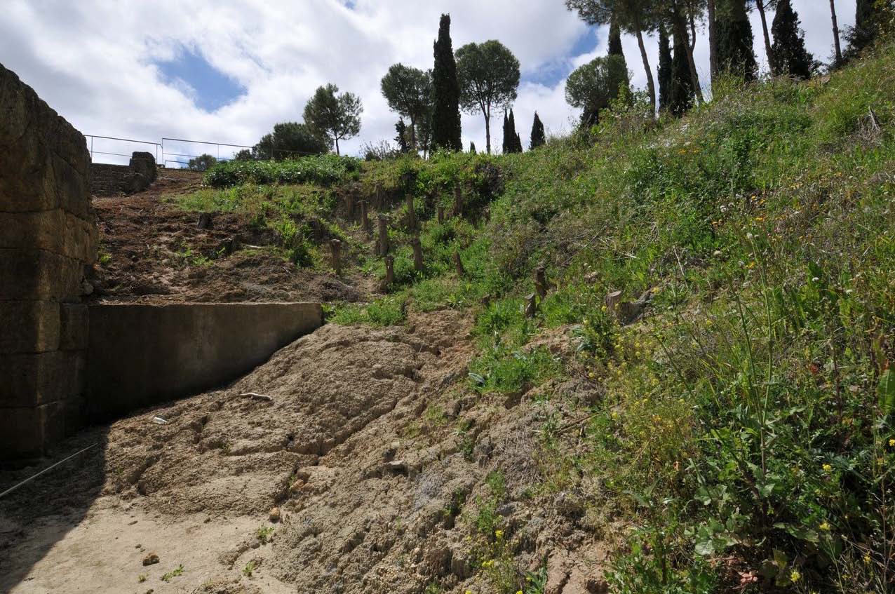 En el ámbito de las laderas norte y oeste, se han rectificado las pendientes con problemas de deslizamiento, aproximándolas al talud natural. Al suavizar la topografía y restituir los perfiles naturales, se produce una mayor correspondencia entre el terreno y los niveles originales de las fachadas del anfiteatro y de sus plataformas de acceso originales.