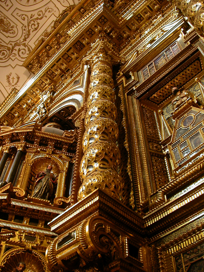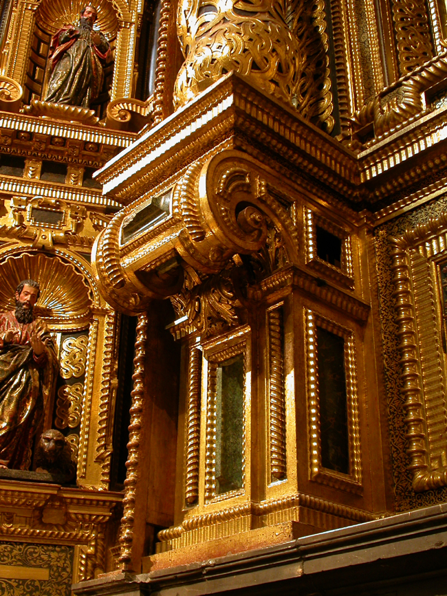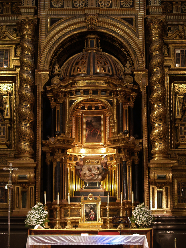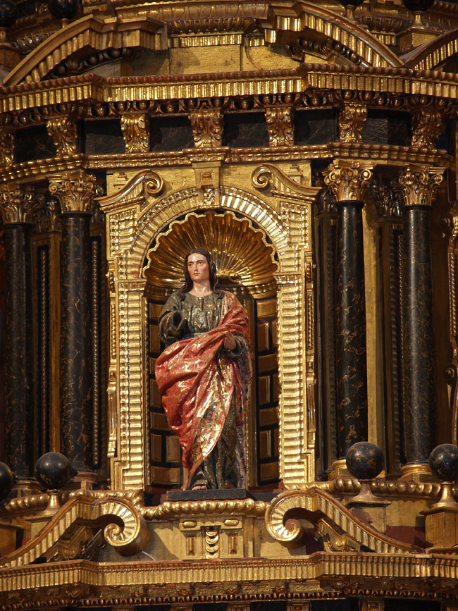 Los retablos del crucero se ejecutaron, salvo en su policromía y dorado, en la década de 1640. En la arquitectura del retablo mayor se trabajó desde, al menos, 1650 hasta 1664, distribuyéndose por ella diversos elementos pictóricos y escultóricos además de una serie de relicarios. Los relicarios, parte de ellos en dos esculturas de busto, y quizá el Crucificado del ático, del estilo de Pablo de Rojas, son piezas rescatadas de un retablo precedente inaugurado en 1610. En el manifestador se colocaron una serie de pinturas flamencas sobre cobre y seis esculturas, de las que cuatro, las de los Evangelistas, se atribuyen a Pedro de Mena. Por último, los lienzos que completan el conjunto, obra del pintor Pedro Atanasio Bocanegra, fueron pintados entre 1663 y 1679.