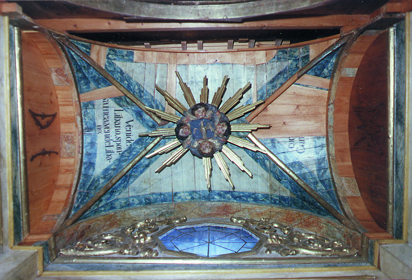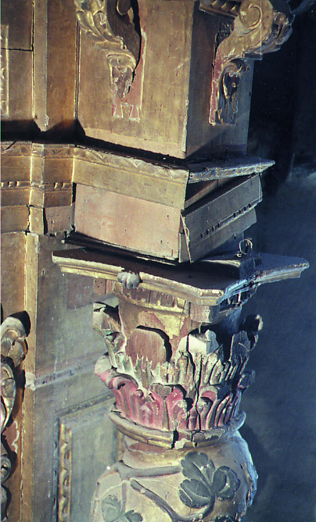 En cambio, toda la caja del camarín estaba desplomada hacia delante. A esto se sumaba una fuerte desnivelación hacia la izquierda y el hundimiento de la bóveda del camarín, que había ocasionado la pérdida de numerosas piezas.