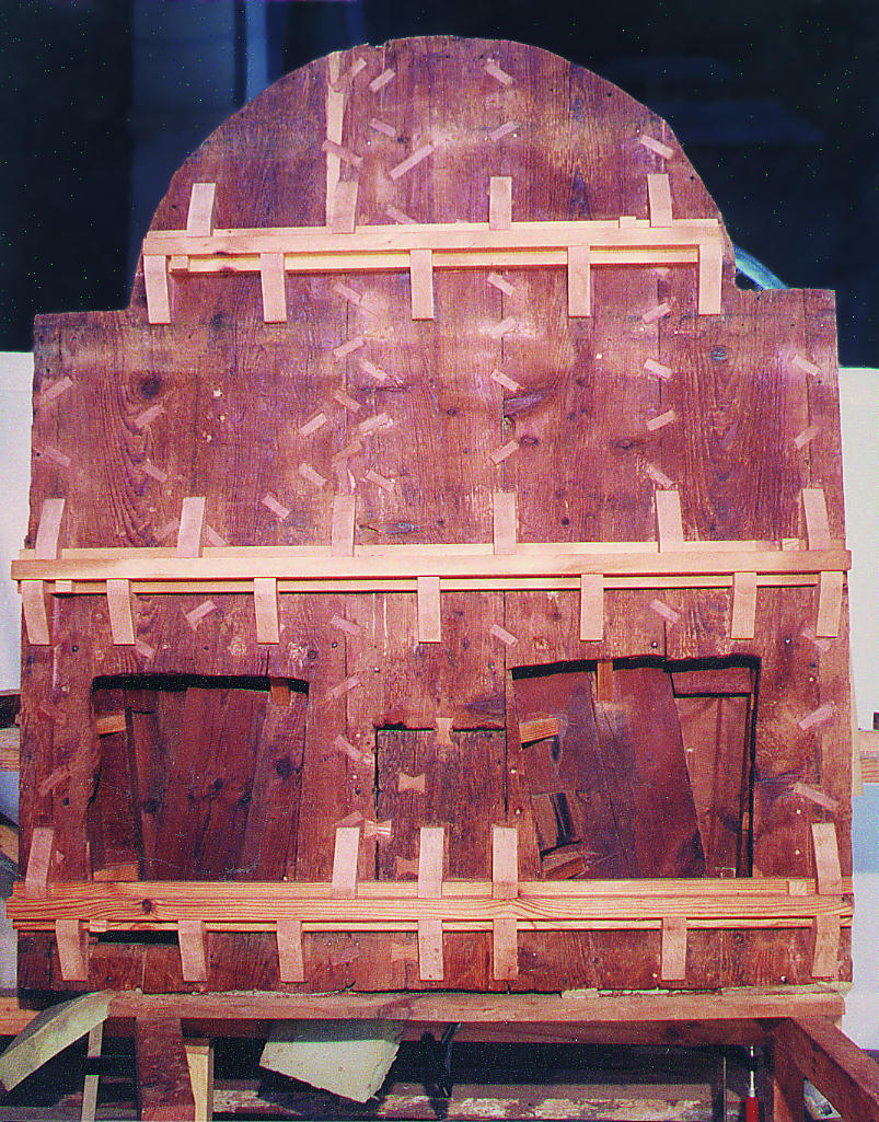 El material lígneo se consolidó según el grado de alteración de cada pieza, impregnando e inyectando un consolidante líquido, e injertando en las zonas más degradadas pequeñas piezas de madera de borne curadas y tratadas, en una cama de resina epoxi. Los elementos con función estructural que presentaban este mismo tipo de deterioro se sustituyeron por piezas nuevas de madera curada de pino silvestre o haya.