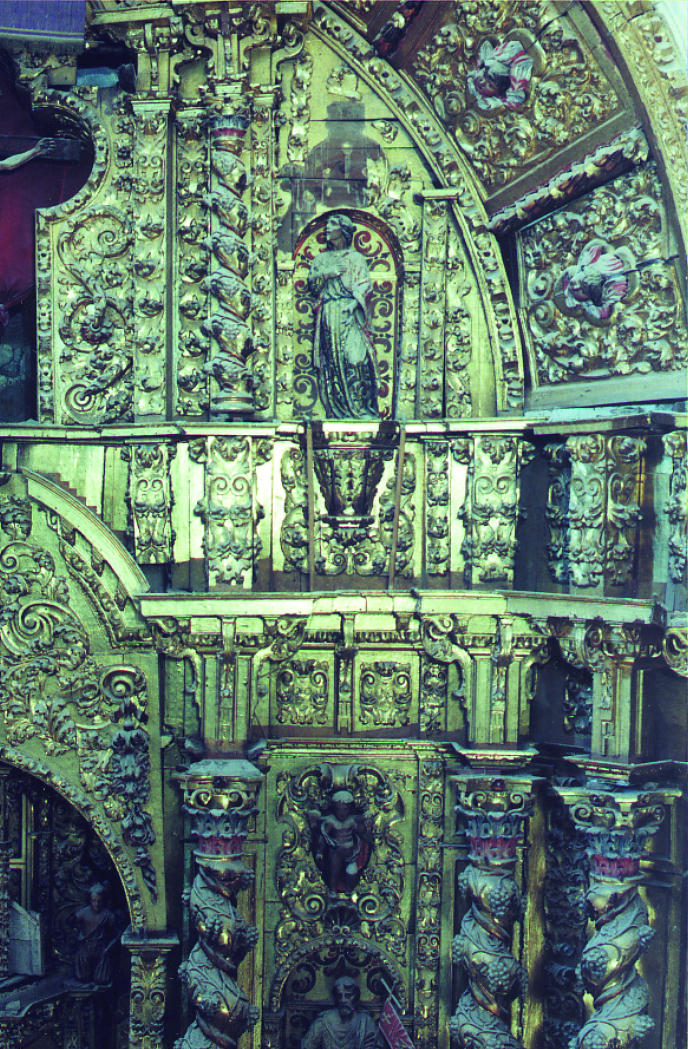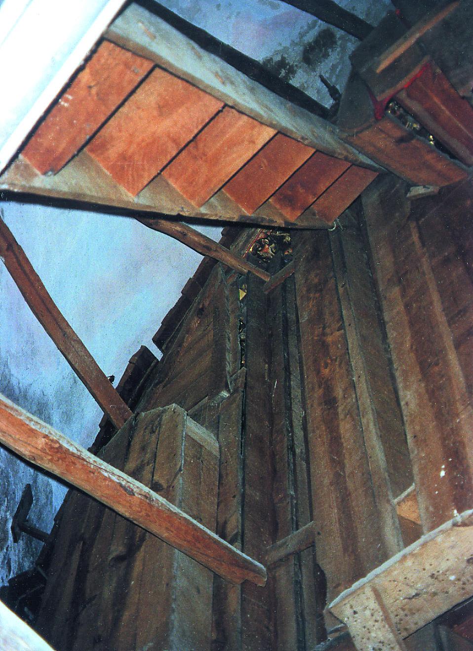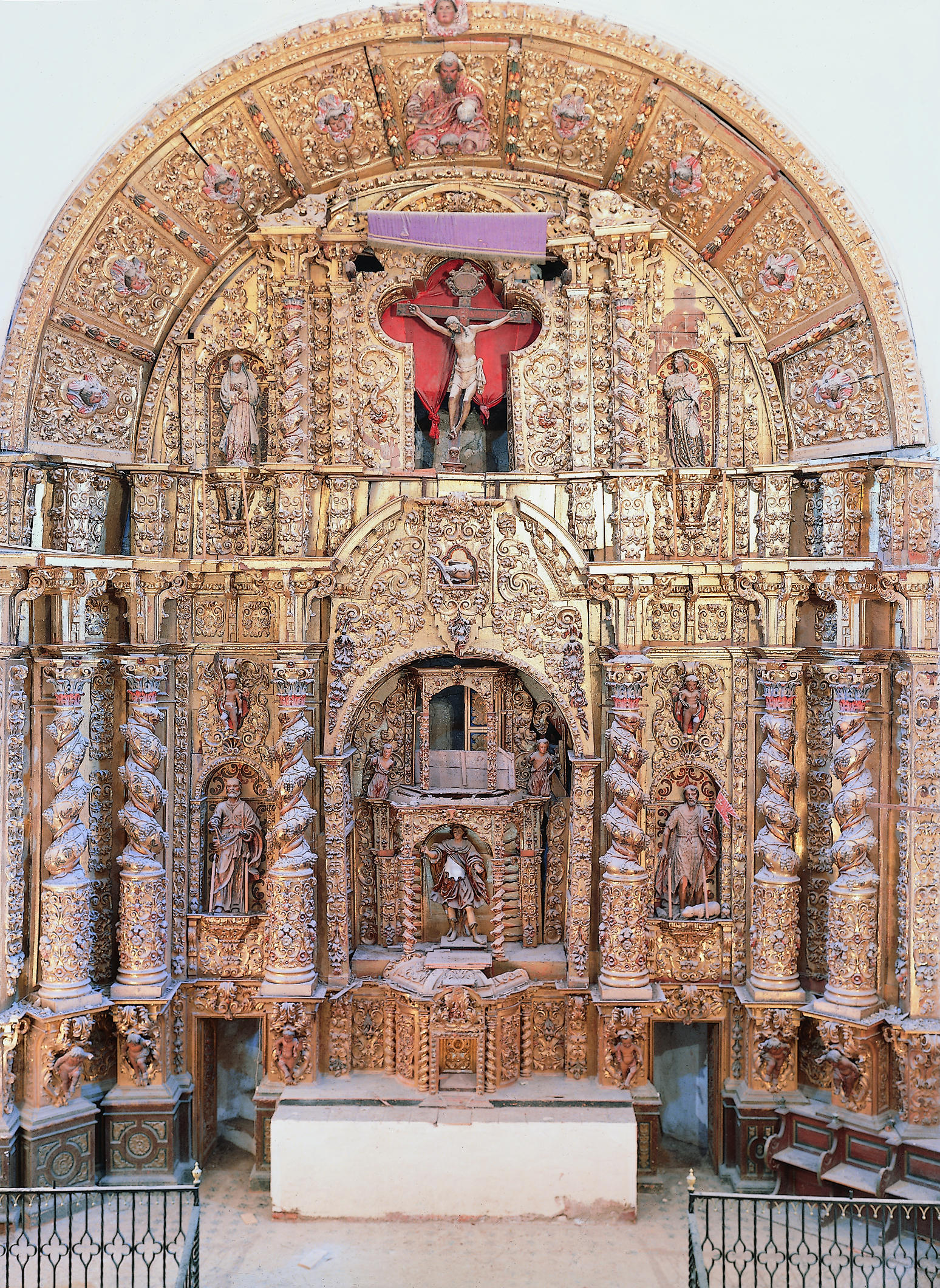 Los trabajos comenzaron por el reverso del retablo. Se realizó una limpieza superficial y se consolidó la madera con una resina acrílica disuelta en disolvente orgánico. A continuación se procedió a la consolidación de la estructura, que comprendió una serie de tareas: colocación preventiva de tensores para sujetar el cuerpo superior y evitar un mayor desplazamiento del mismo hacia afuera; eliminación de clavos, hierros y pletinas antiguas oxidadas; embarrotado de refuerzo de los distintos paneles; y finalmente, la colocación de nuevos travesaños y de un nuevo sistema de anclaje al muro mediante la inserción de tres pletinas metálicas. También se sustituyó la escalera original de madera que descansaba sobre el retablo, en estado muy precario y con numerosas reparaciones, por otra metálica insertada en el muro y se aplicó un tratamiento insecticida por impregnación e inyección en toda la superficie posterior del retablo, tanto en la madera original como en la nueva. El tratamiento efectuado en el muro consistió en la limpieza de capas de cal, fijación de los morteros, eliminación y reposición de los repellados modernos y reposición de peldaños de la escalera de fábrica de ladrillo.