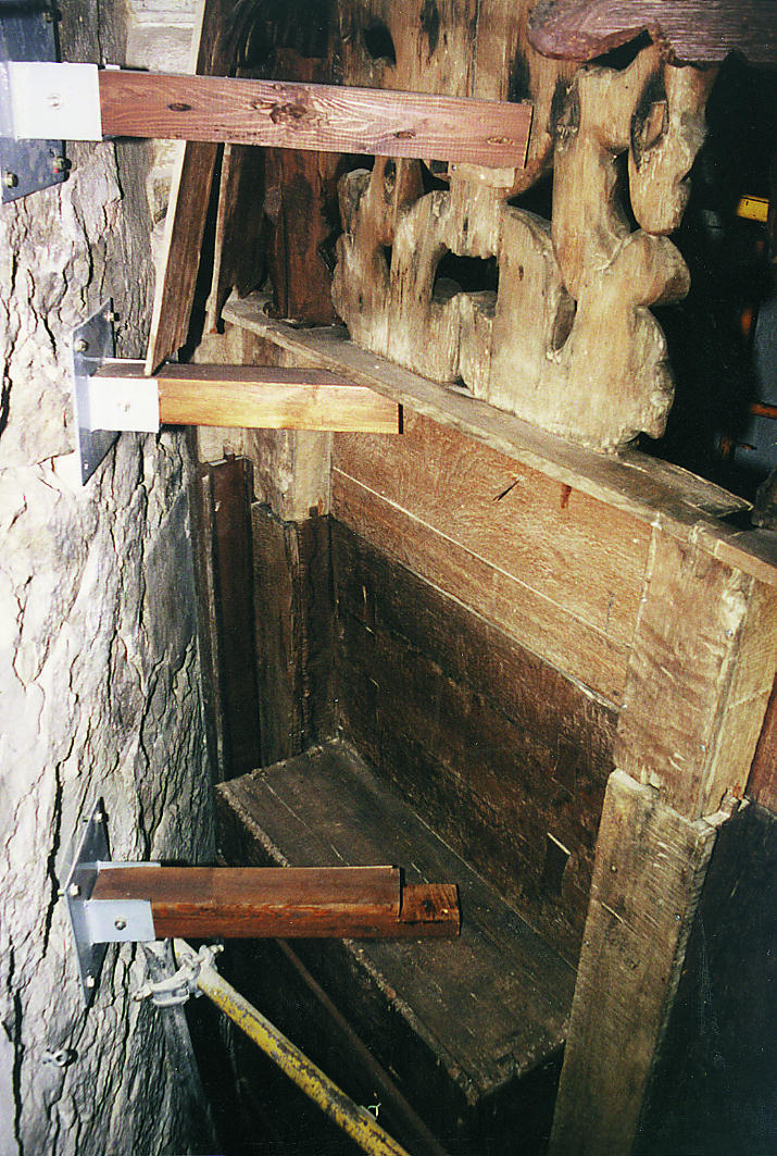 Tras una limpieza minuciosa se ajustaron y ensamblaron las piezas desencajadas mediante encolado, espigado y, en algunos casos, pequeños trozos de madera injertados y tratados previamente. Todos los clavos en mal estado se sustituyeron por puntas y tornillos metálicos inoxidables. Se repusieron las tablas en mal estado o desaparecidas y se consolidó la madera. Por último se aplicó una capa de protección.