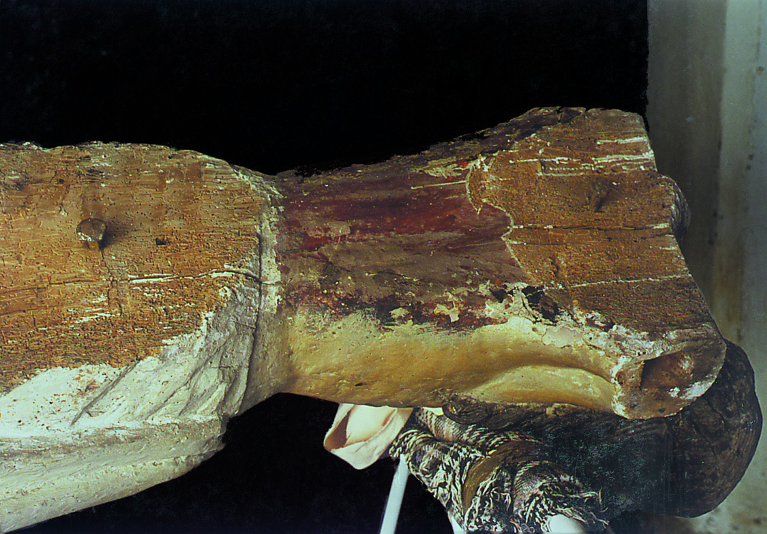 Con respecto a la cruz, el principal problema que presentaba era la falta de solidez estructural para soportar el peso de la escultura, ya que el palo vertical estaba cortado por debajo del ensamble con el horizontal.