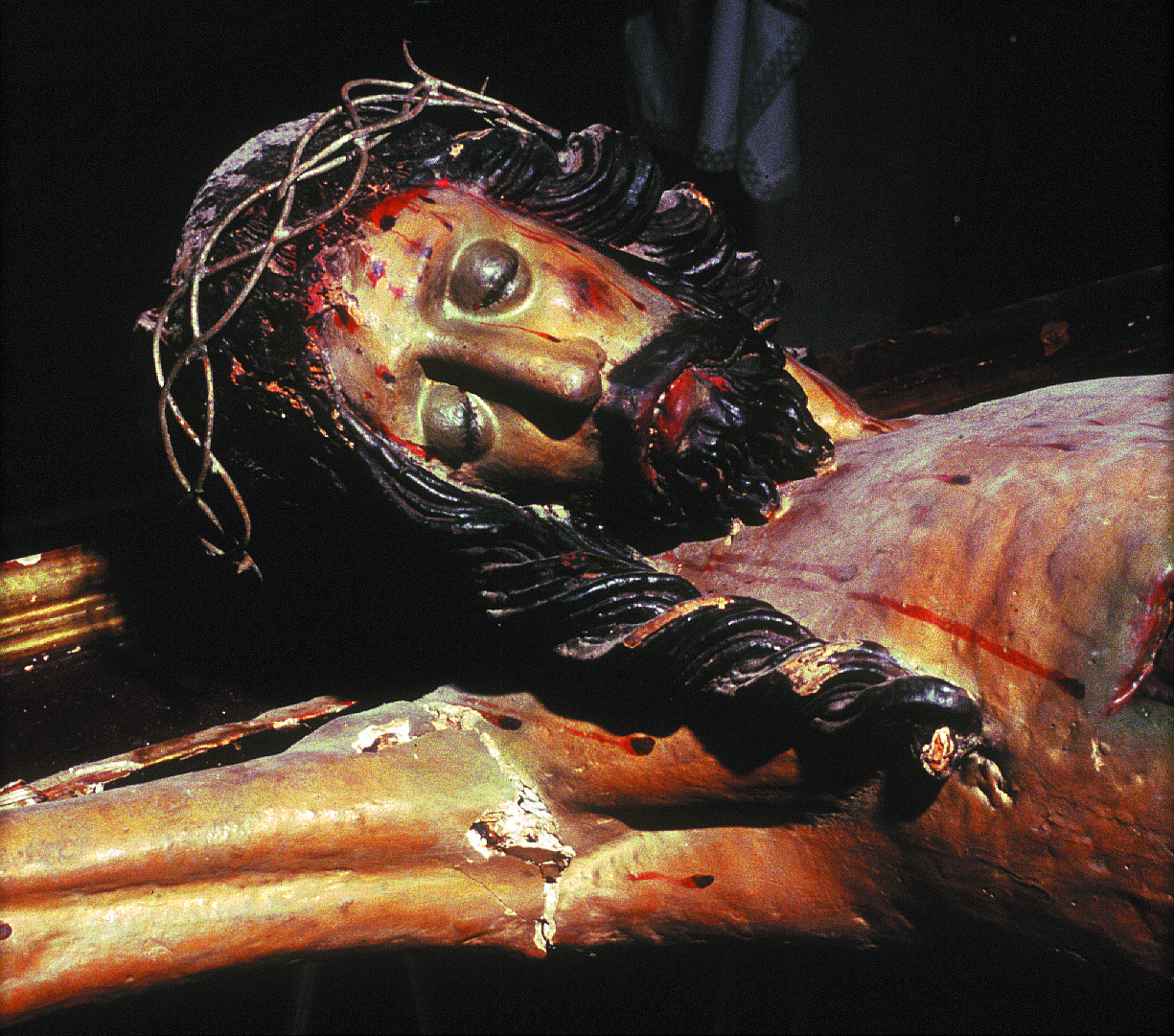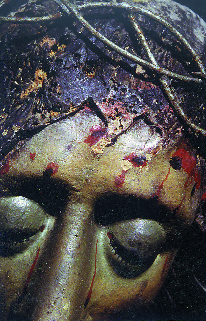 Gran parte de los daños que presentaba la escultura habían sido causados en el curso de anteriores intervenciones. La más importante tuvo lugar al colocar la imagen en el retablo de forma totalmente paralela al plano de la cruz, para lo cual se mutiló el reverso y se readaptaron los ensambles de los brazos hasta conseguir llevarlos hacia adelante y anular el arqueo y la tensión propia de los mismos. Por alguna razón, en ese o en algún otro momento, fueron amputadas también las manos y sustituidas por otras. A esto se suma la rotura de las piernas y la pérdida de fragmentos en ambos pies, ocasionados por golpes sufridos durante la Guerra Civil, según el testimonio popular. Por otra parte, la desaparición de parte del cabello y la presencia de numerosas perforaciones evidencian cambios de coronas y potencias a lo largo del tiempo.