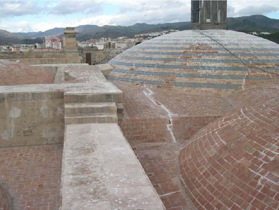 La forma general de la cubierta, en la que los altos muros perimetrales y centrales alcanzan una cota mucho mayor que el plano por donde circulan las aguas, formando a modo de albercas, produce problemas de estancamiento de las mismas, con el consiguiente deterioro por filtración a través de las bóvedas y filtración y acumulación en los rellenos de los riñones de las mismas. Las caras superiores y laterales de los muros constituyen otras vías de entrada de agua, que se infiltra hacia las fábricas, descendiendo al interior del edificio.