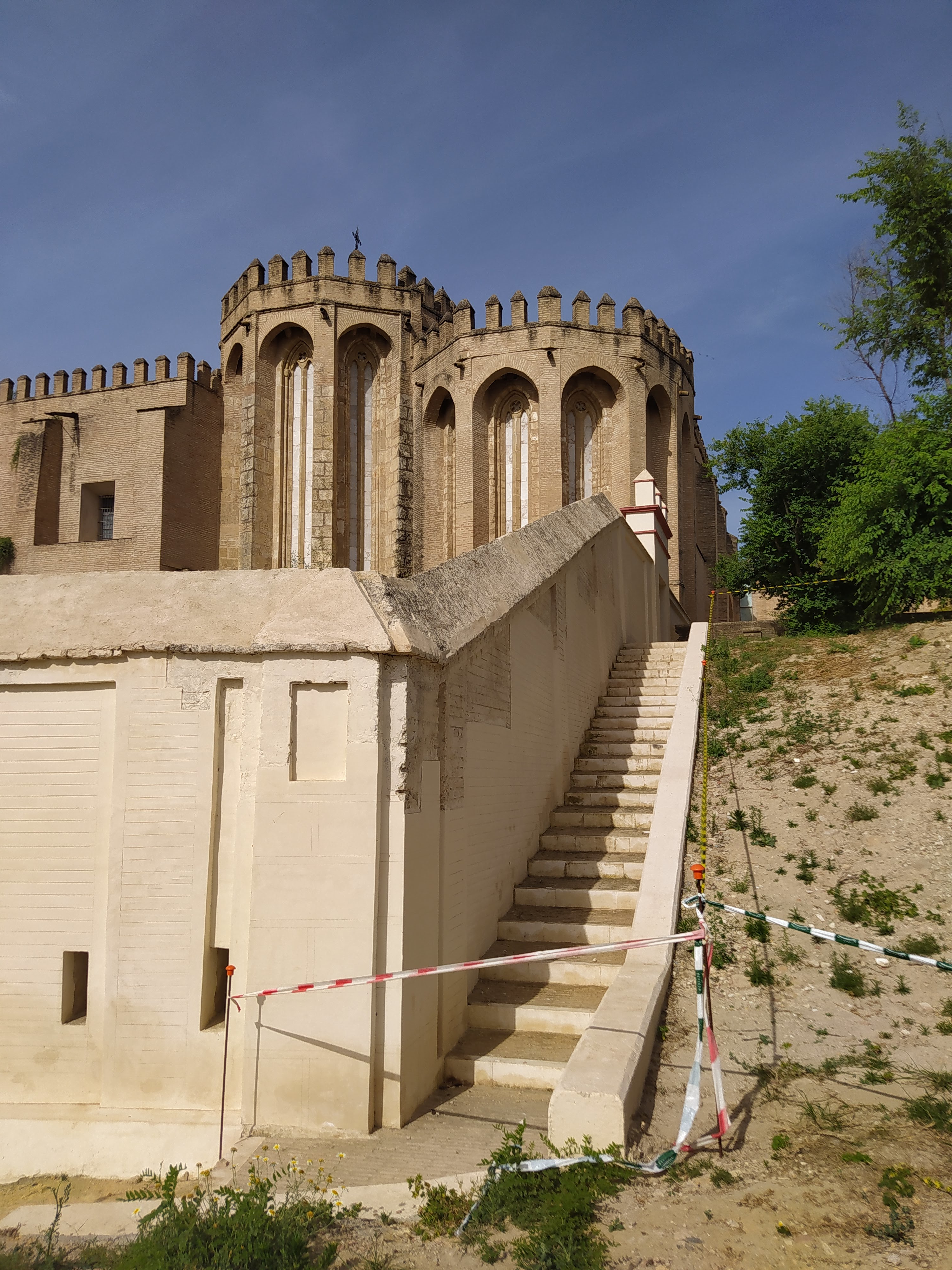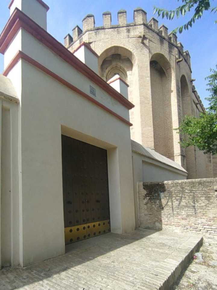 La puerta de acceso a la zona posterior de los ábsides que existe en el encuentro de la cerca con la iglesia, fue construida en los años setenta del S. XX por el arquitecto Félix Hernández en el sitio de otra antigua puerta de características similares. Sin embargo, donde hasta ahora había una cubierta de teja a cuatro aguas que cubría toda la puerta, la iconografía (N. Chapuy, c. 1835) muestra un marcado adovelado de ladrillo y remate plano con tres almenillas al que posteriormente se añadió un tejaroz, al menos en la cara exterior (Laboratorio de Arte, Universidad de Sevilla, 1919), se desconoce si también en la interior. El estado de deterioro, la rotura de la fábrica y la amenaza de colapso aconsejaron el tapiado y apeo de la misma.