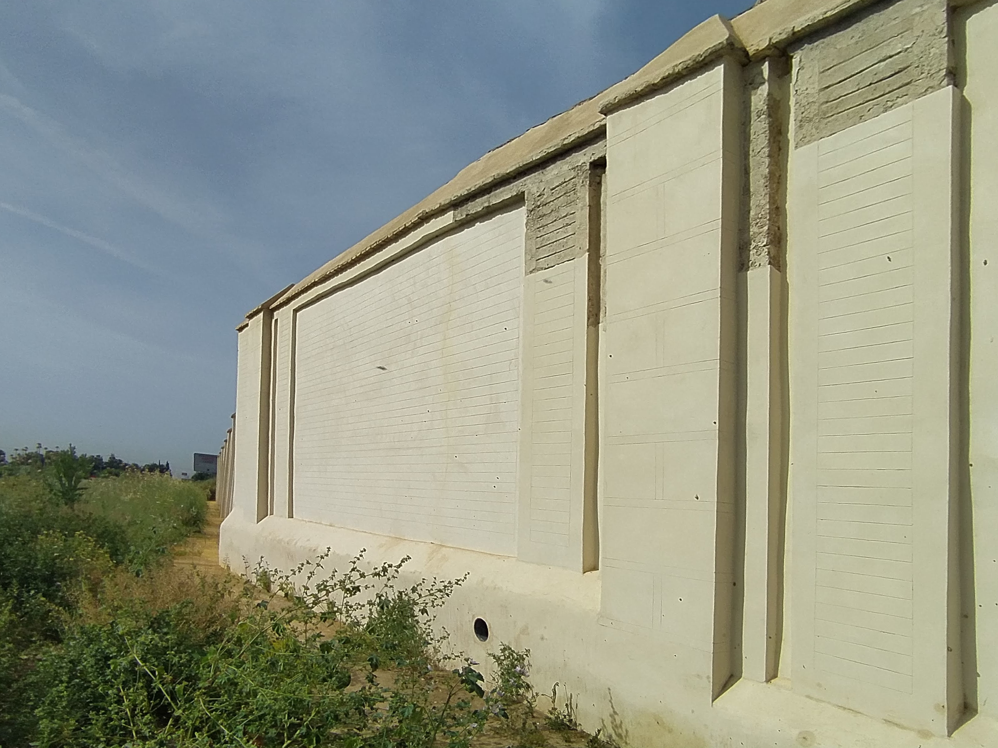 Tramos en los que la cerca había sufrido movimientos significativos, fundamentalmente giros normales a su plano, que afectan a su equilibrio; estos tramos se encontraban sostenidos por pares de contrafuertes de ladrillo, y también presentaban los daños superficiales descritos en el primer punto.
