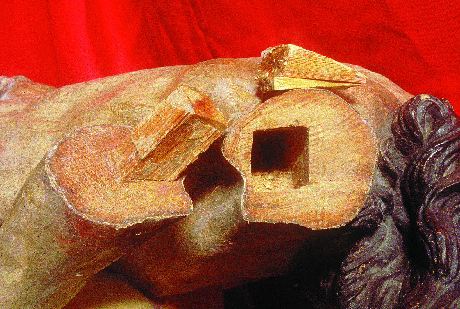 Tras la fijación de los estratos pictóricos, se separaron los brazos y se colocaron en las uniones tiras de papel japonés encoladas para evitar posibles desprendimientos de la policromía. Una vez extraídos los clavos que los sujetaban, se observó que en fechas anteriores a esta intervención se había ampliado el hueco del ensamble del hombro derecho para introducir en él cuñas y se había reforzado con espigas el ensamble del hombro izquierdo. Según se comprobó, las distintas piezas estaban sueltas y las colas cristalizadas. Éstas fueron eliminadas mecánicamente, en algún caso reblandeciéndolas previamente con cola blanca. Se quitaron todas las piezas añadidas y se procedió a un nuevo ensamblado utilizando espigas y pasta de madera, y en el brazo derecho colocando una nueva cuña.