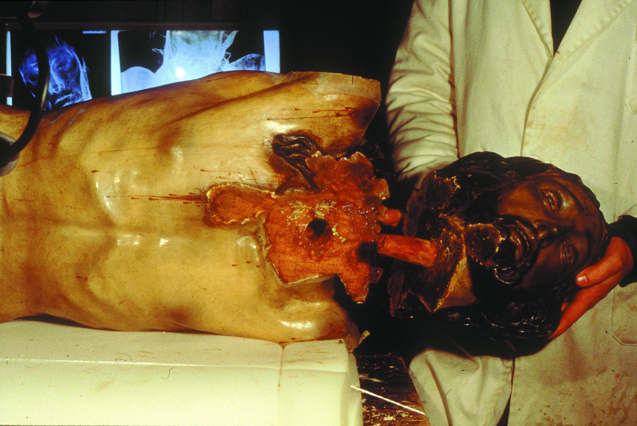 Una vez protegida la policromía en las zonas colindantes a los ensambles, se procedió a la separación de piezas -cabeza, brazos y tapa posterior del tórax- reblandeciendo los adhesivos e insertando cuñas. Todos los elementos metálicos aparecidos se eliminaron y se sustituyeron por espigas de madera de haya. En vista de que el sistema de sujeción a la cruz perjudicaba la conservación de la imagen, se realizó uno nuevo en acero inoxidable consistente en un tubo con rosca interior soldado a un disco, el cual se embutió en el plano inferior sobre el que descansa la tapa. También se aumentó la superficie de unión de la tapa al tronco añadiendo dos piezas de madera dispuestas a lo ancho ensambladas por sus extremos a los bordes del hueco interior del tronco. La zona que alojaba el antiguo anclaje se reconstruyó, al igual que una falange desaparecida de la mano derecha, y la unión de las dos piezas que forman la tapa se reforzó con toledanas.