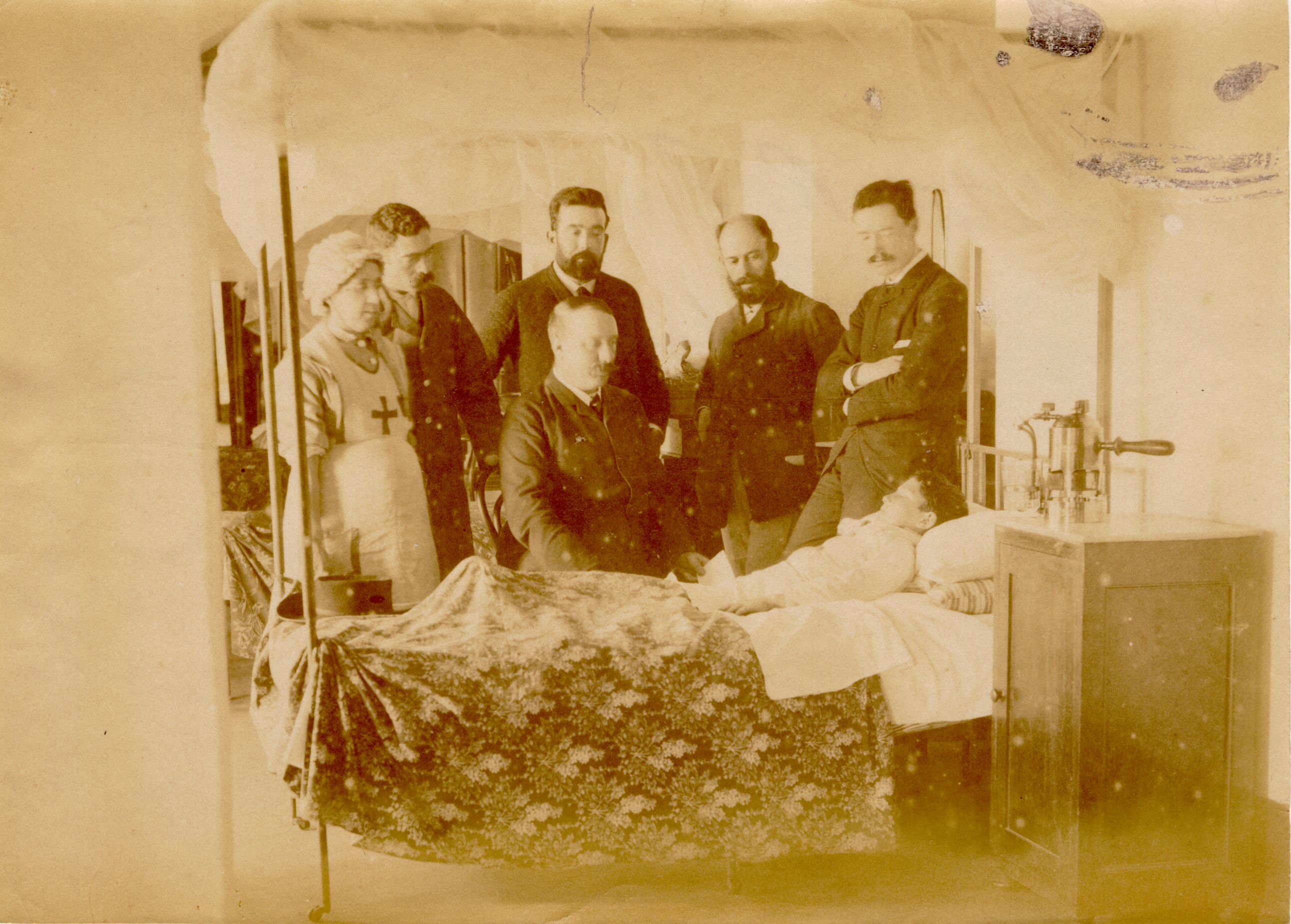 | Interior del hospital de Riotinto, con los doctores MacKay y Sánchez sobre un enfermo. Fecha [ca. 1895]. AHPH. Colección fotográfica de la Compañía de Riotinto, signatura F-003/0022. |