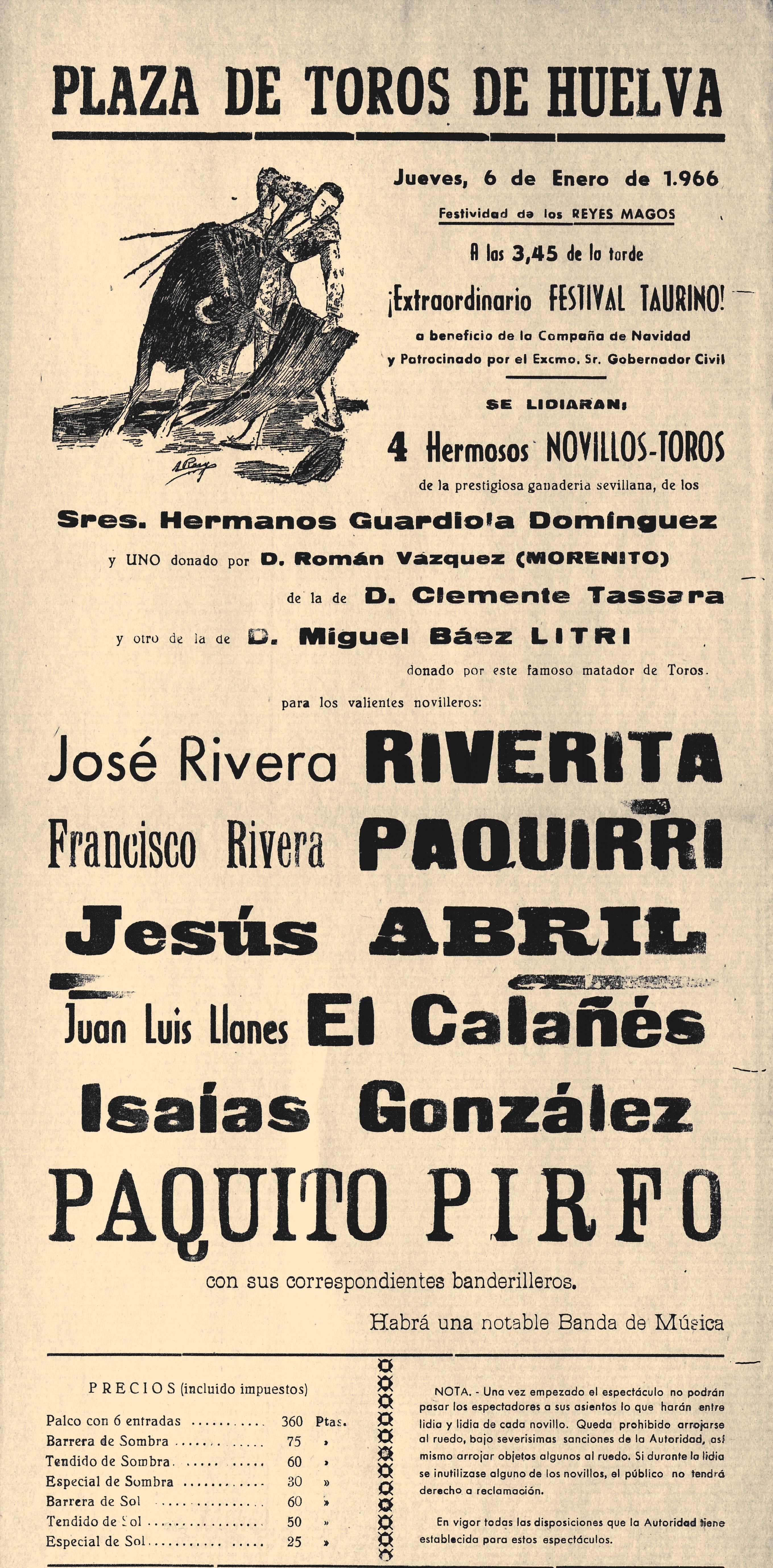 Cartel del festival taurino organizado el día de Reyes a beneficio de la campaña de navidad. Año 1966. AHPH. Colección de carteles.