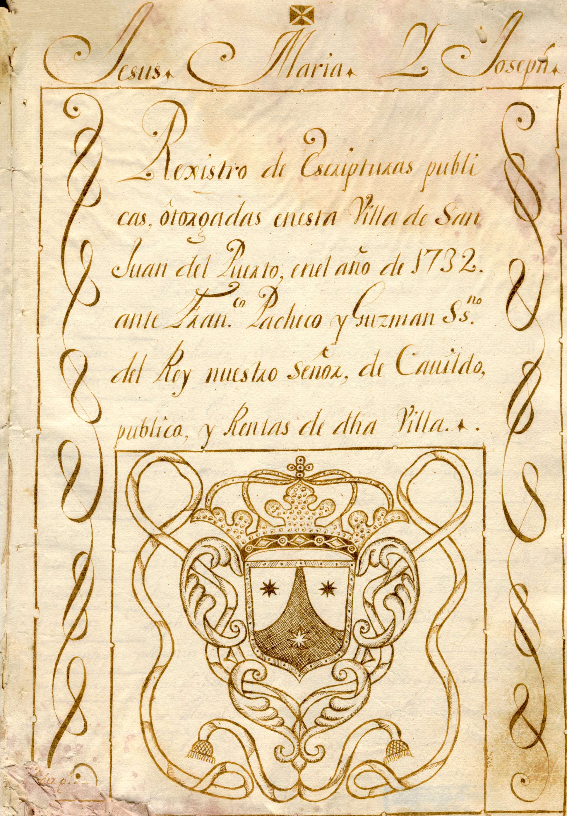 | Escudo de la Orden del Carmen dibujado sobre un Registro de Protocolos del pueblo de San Juan del Puerto, del escribano Francisco Pacheco y Guzmán. Año 1732. AHPH. Protocolos Notariales, signatura 05172. |