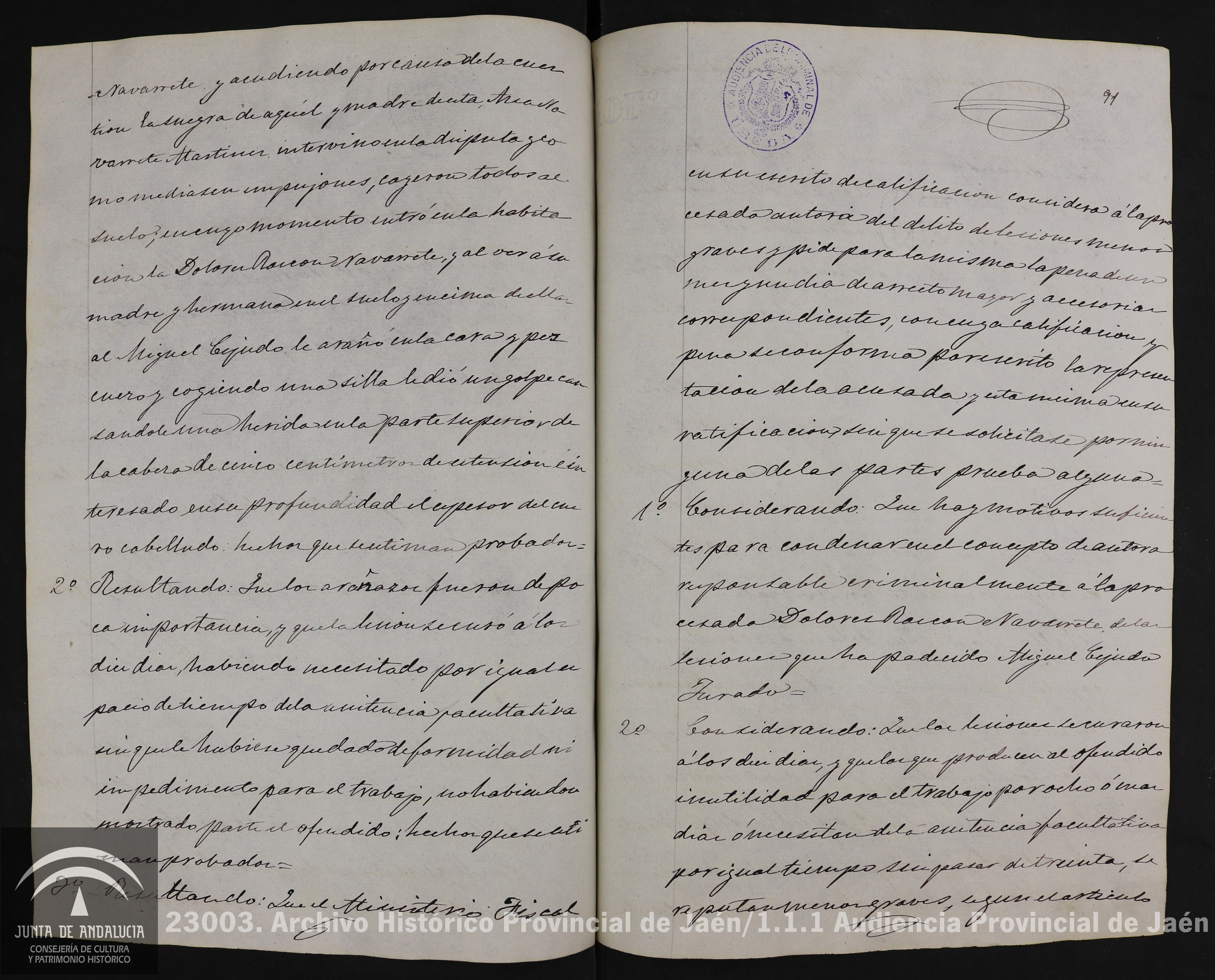 Documento 2. Sentencia pronunciada el 28 de julio de 1883 por la audiencia de lo criminal de Úbeda en la que se condena por lesiones a una viuda de 40 años, vecina de Baeza con una multa de 125 pesetas, por intervenir y darle con una silla en la cabeza a su cuñado, ebrio, que pegaba a su esposa y suegra (hermana y madre de la acusada), teniéndolas en el suelo. La defensora, en este caso, se convirtió en culpable para la Justicia, pues lo que estaba teniendo lugar, según la sentencia, era una “disputa con su mujer”.
