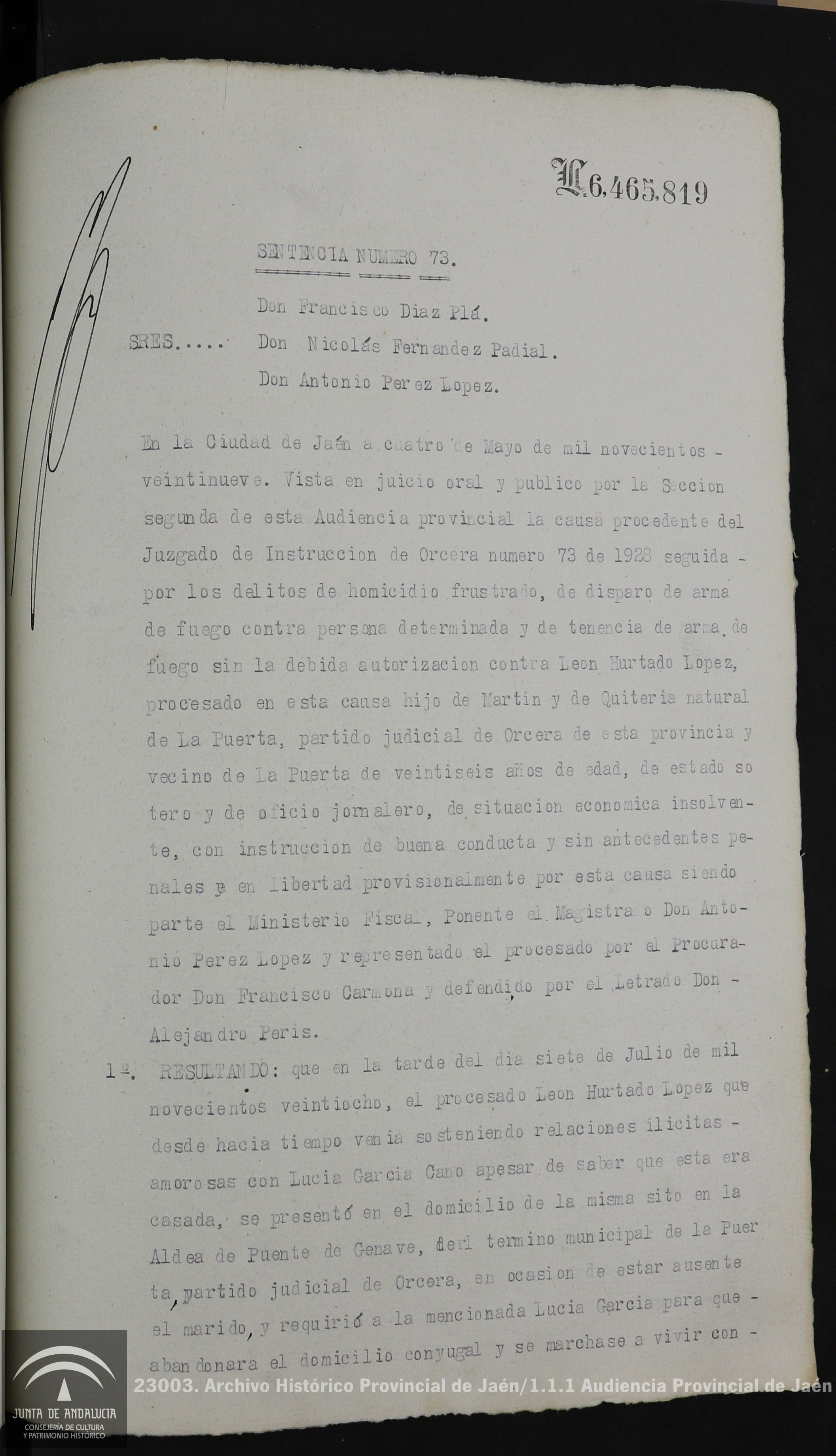 Documento 3. Sentencia pronunciada el 4 de mayo de 1929, contra un vecino de La Puerta, de 26 años, por intento de homicidio y tenencia de armas de fuego sin autorización, cuando una mujer casada se negó a abandonar el domicilio conyugal en Puente Génave para ”hacer vida marital con él”. Ante lo cual, hizo cuatro disparos con una pistola que la alcanzaron produciéndole heridas, de las que tardó en curar 33 días, alcanzando también con uno de ellos a la madre de ella, que se interpuso para que no disparara más. En este caso, como ocurre tantas veces, el agresor intentó quitarse la vida, pero después de haber cometido la agresión. Fue condenado a tres años de prisión por un delito de tentativa de homicidio.