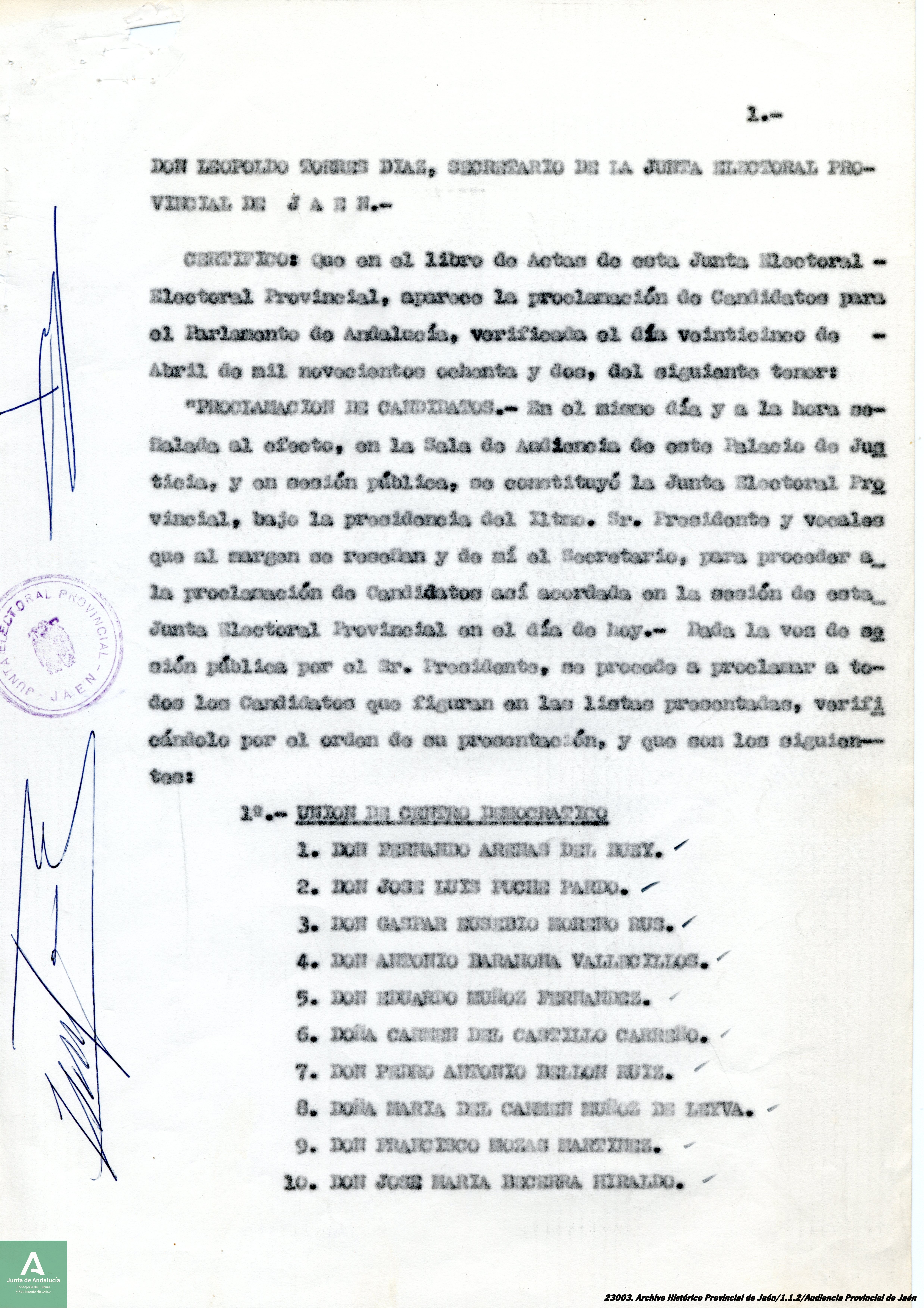 Documento 4. Proclamación de las candidaturas por la Junta Electoral Provincial de Jaén al Parlamento de Andalucía.