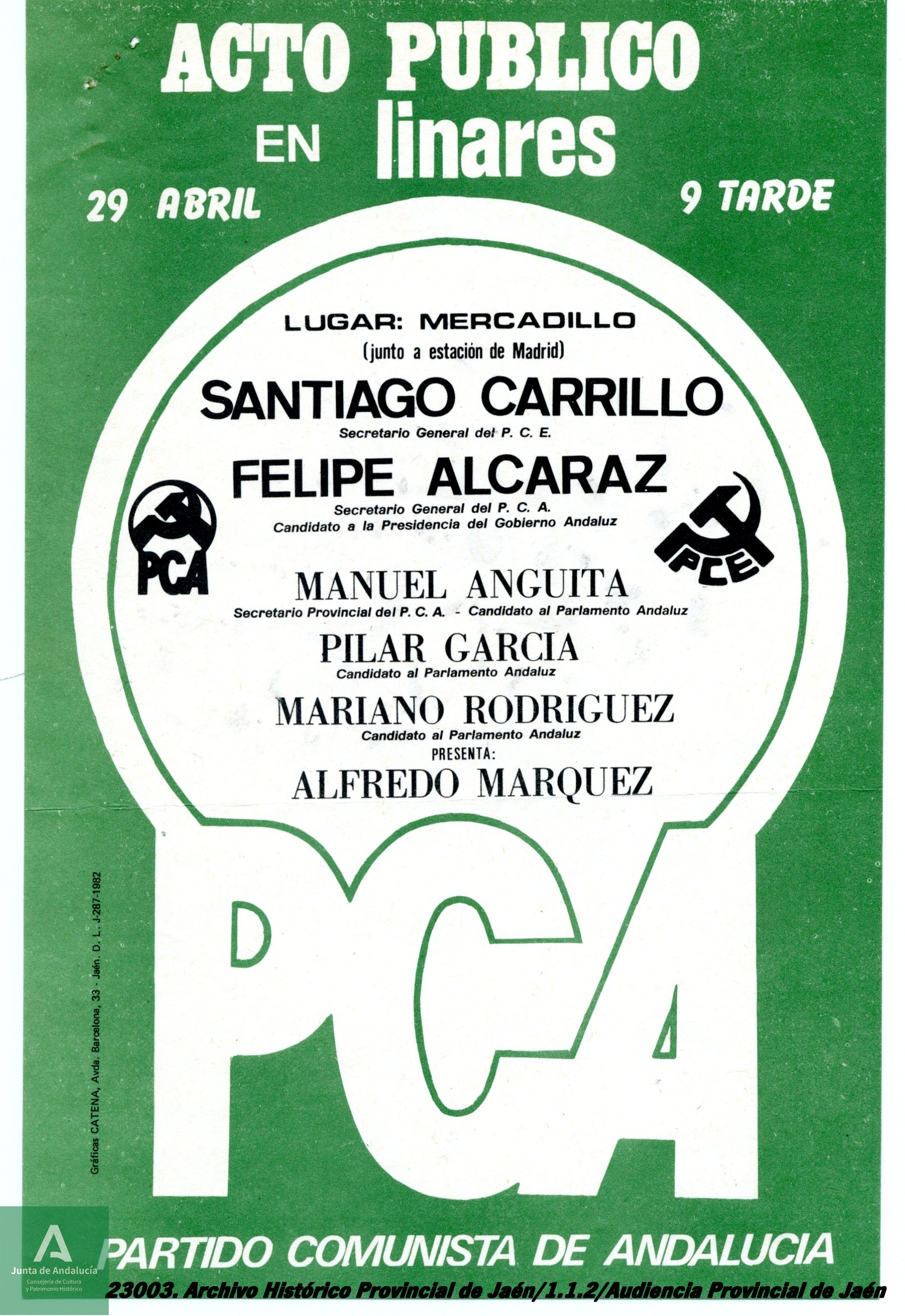 - Documento 7. Cartel de acto público del Partido Comunista de Andalucía en Linares con la asistencia de Santiago Carrillo entre otros (JPG 1.63 MB)