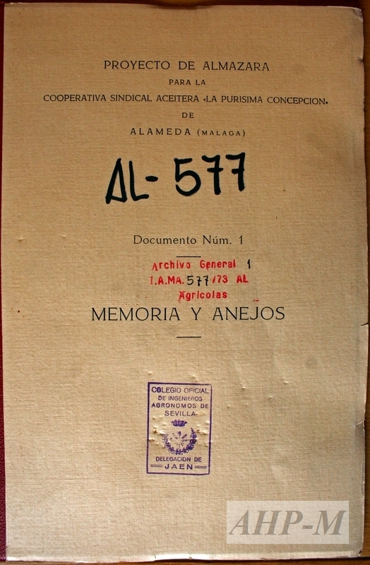 1958, agosto. Jaén. Archivo Histórico Provincial de Málaga. Secc. Delegación P. Agricultura. Sig. 3.765. Proyecto de almazara para la Cooperativa Sindical Aceitera “La Purísima Concepción” de Alameda (Málaga). Memoria y anejos; ingeniero agrónomo: Antonio Luengo Ruiz. JMG.
