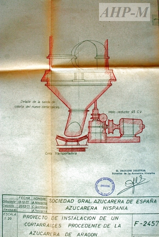 1971, diciembre, 20. Archivo Histórico Provincial de Málaga. Sección Registro Industrial. Sig. 10.453. Instalación de un corta raíces procedente de la Azucarera de Aragón para la Azucarera “Hispania” de Málaga. Proyecto; plano (detalle); ingeniero industrial: Andrés Félez Romero. JMG.