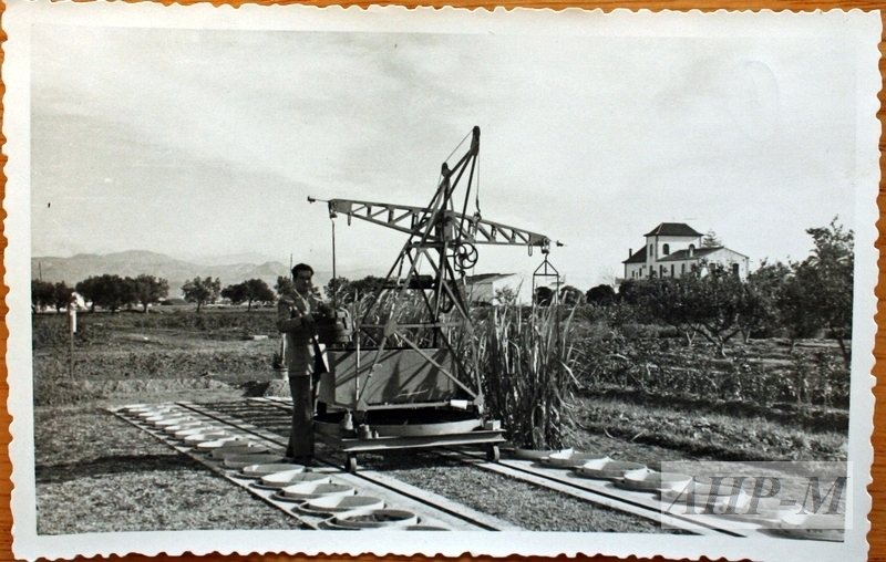 [1960]. Málaga. Archivo Histórico Provincial de Málaga. Centro de Investigación y Formación Agraria Sig. 3/4/235-1-4. Maquinaria agrícola utilizada en el Centro Experimental para la caña de azúcar. Fotografía; b/n. Observ.: Al fondo de la imagen se aprecia el Centro Experimental de Churriana. MFE.