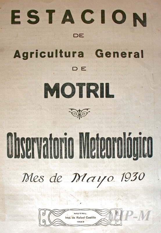 1930, mayo. Motril (Granada). Archivo Histórico Provincial de Málaga. Centro de Investigación y Formación Agraria Sig.74700/5. Observaciones meteorológicas efectuadas durante el mes de mayo de 1930. Estadísticas. Observ.: Impreso en el que se recogen los datos sobre la presión, las temperaturas y otros fenómenos meteorológicos en la Estación de Agricultura General de Motril. MFE.