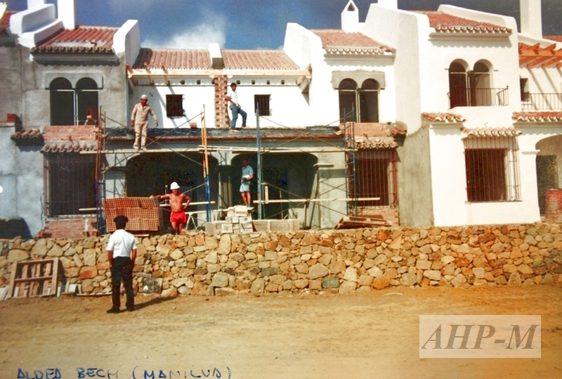 1993. Manilva. Archivo Histórico Provincial de Málaga. Demarcación de Costas. Sig. 802/5. Viviendas en construcción en la urbanización Aldea Beach. Fotografía color; 15 x 10 cm. Observ.: Se contempla el andamio exterior y no se aprecian elementos de seguridad en el trabajo en los albañiles que están realizando la obra. JAV.