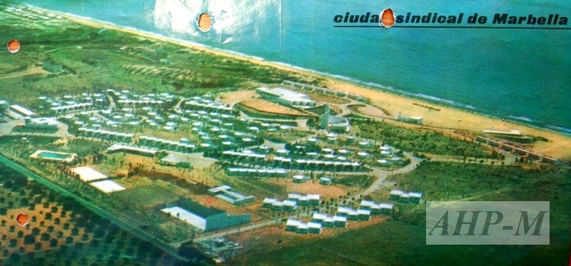[1960-1970]. Marbella. Archivo Histórico Provincial de Málaga. Organización Sindical. AISS. Sig. 28.822. Ciudad Sindical de Marbella, adscrita a la Obra Sindical de Educación y Descanso y dedicada al turismo y vacaciones de los empleados de la Organización Sindical y A.I.S.S. (Administración Institucional de Servicios Socioprofesionales). Reproducción en cuatricromía; offset; recortada posiblemente de una página de revista o folleto publicitario; 26 x 12,5 cm. JAV.